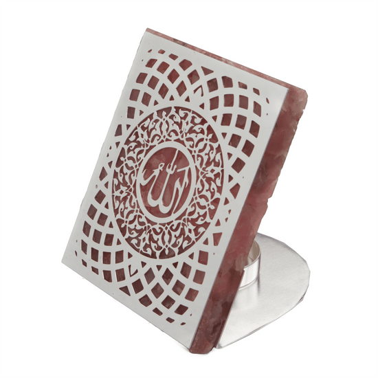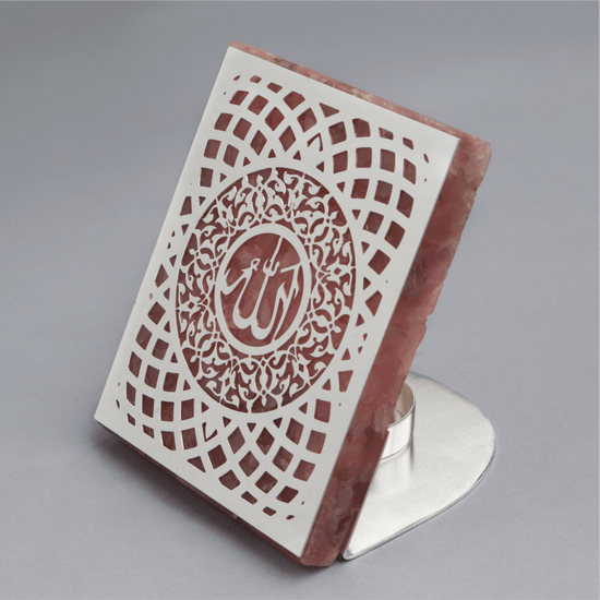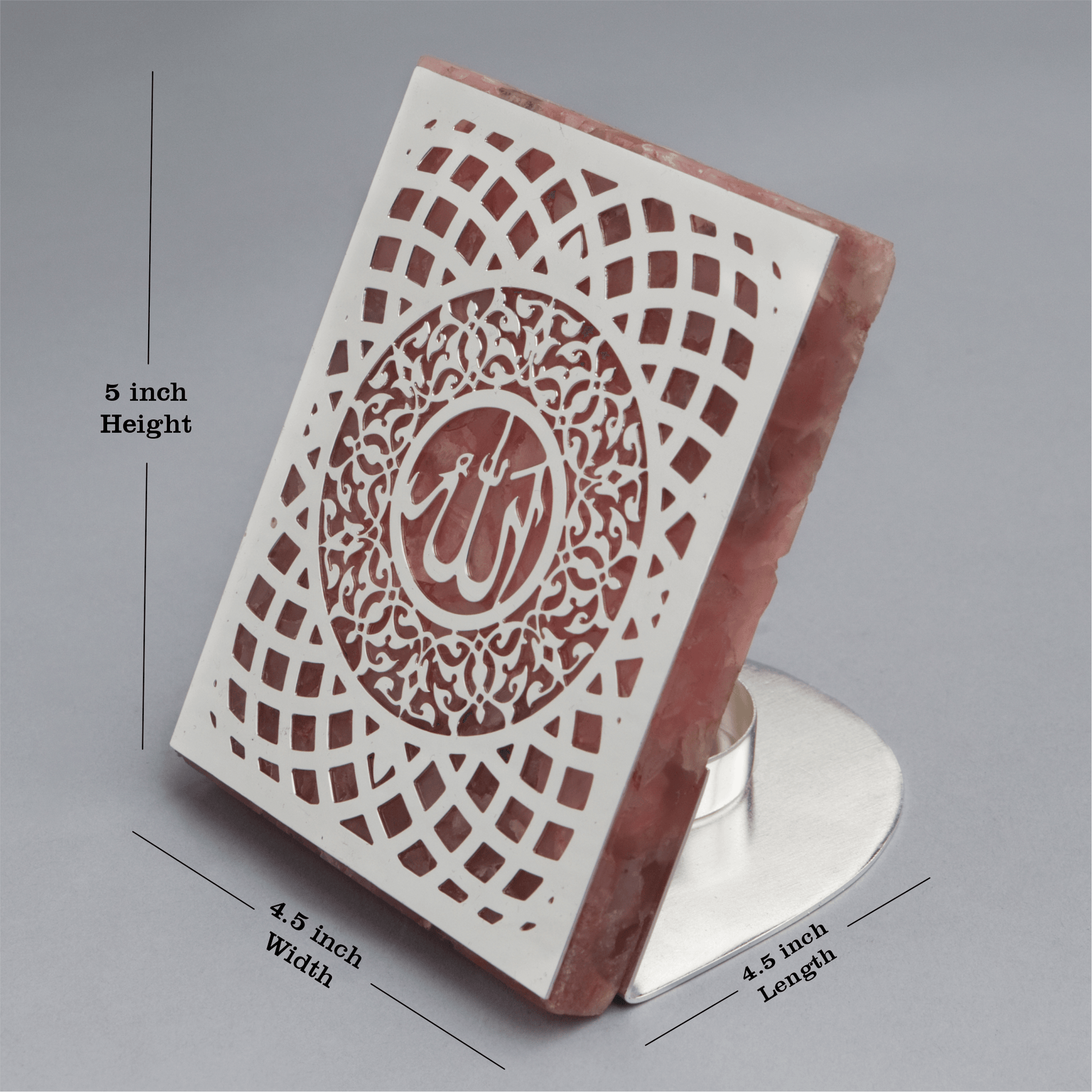 This Allah Tea Light holder is an artifact which is handcrafted by our creative artisans from a brass sheet and heavily Silver Plated with an Anti – Tarnish coat for lasting and enduring use. It is set on a thick Rose Quartz base and set on a metal stand which houses a tea - light. The glow of the light passes through the rose quartz and illuminates the brass sheet which gives the most soothing look to this item. This Allah tea - light holder is perfect for Gifting or as a Keepsake as it spreads Light and Positive energy wherever it is kept.
