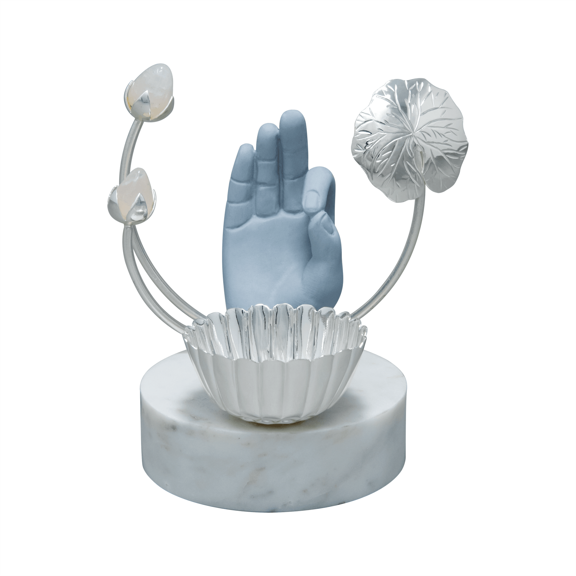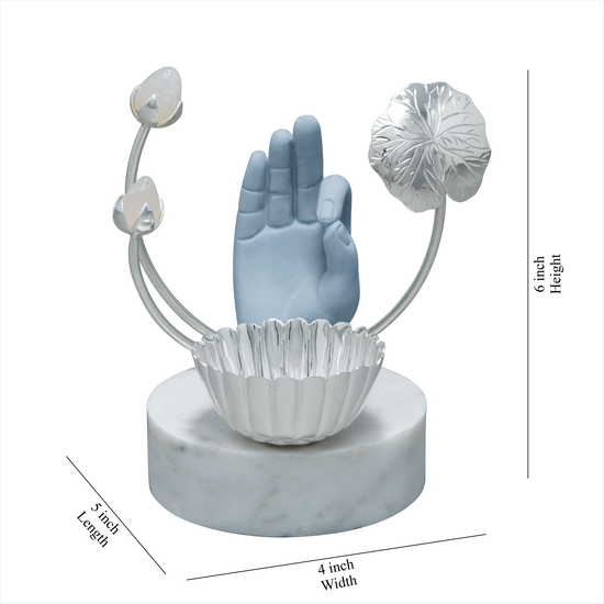 Exquisite Silver Ashirwad Bowl on Marble Base Figure. The poly resin grey-colored Blessing Hands are decorated with silver-plated artistic highlights in an anti-tarnish finish.
