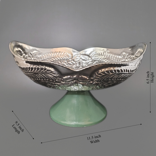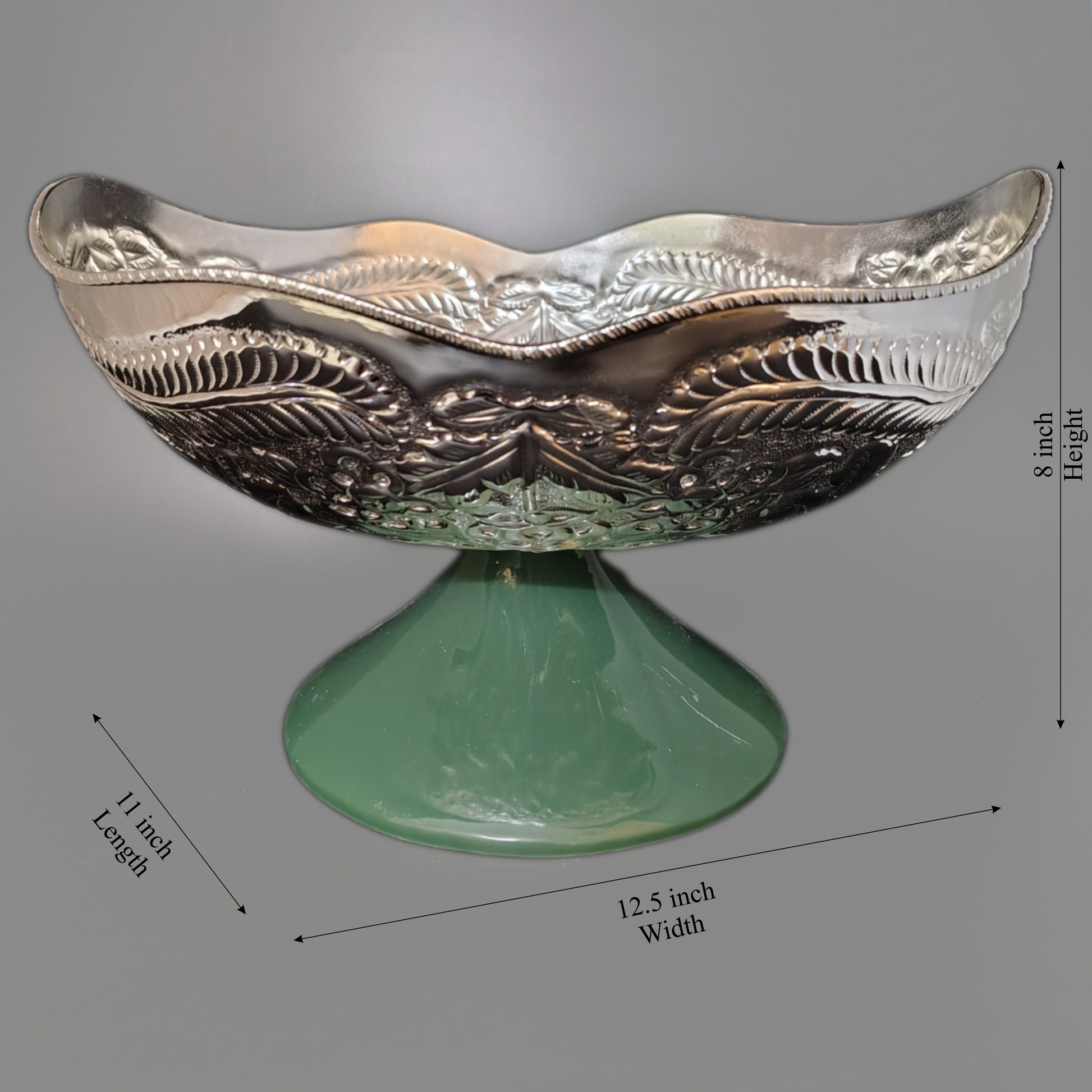 This Badam centre Piece is crafted from high-quality brass and plated with silver for a luxurious finish. The intricate design showcases expert craftsmanship, making it a stunning addition to any home decor. Elevate the style and sophistication of your living space with this beautiful piece.