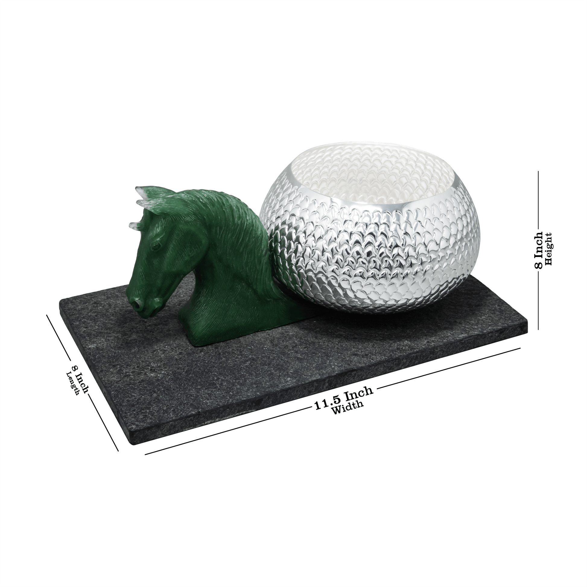 Add a touch of equestrian elegance to your decor with this Horse Bowl. The stunning horse, crafted from green resin, stands gracefully atop a brass bowl with silver plating, all resting on a sturdy wooden base. Perfect for showcasing fruits, candies, or as a standalone statement piece.