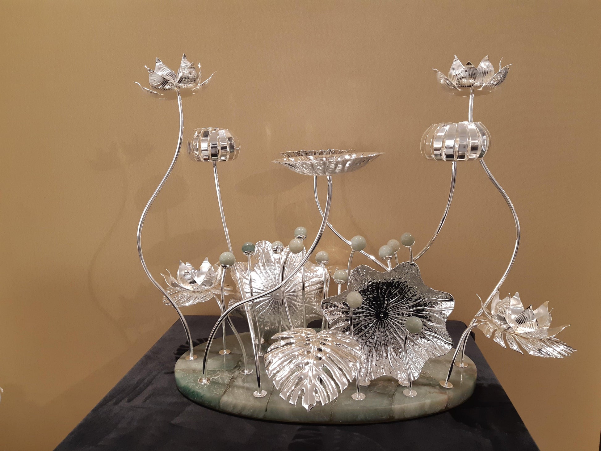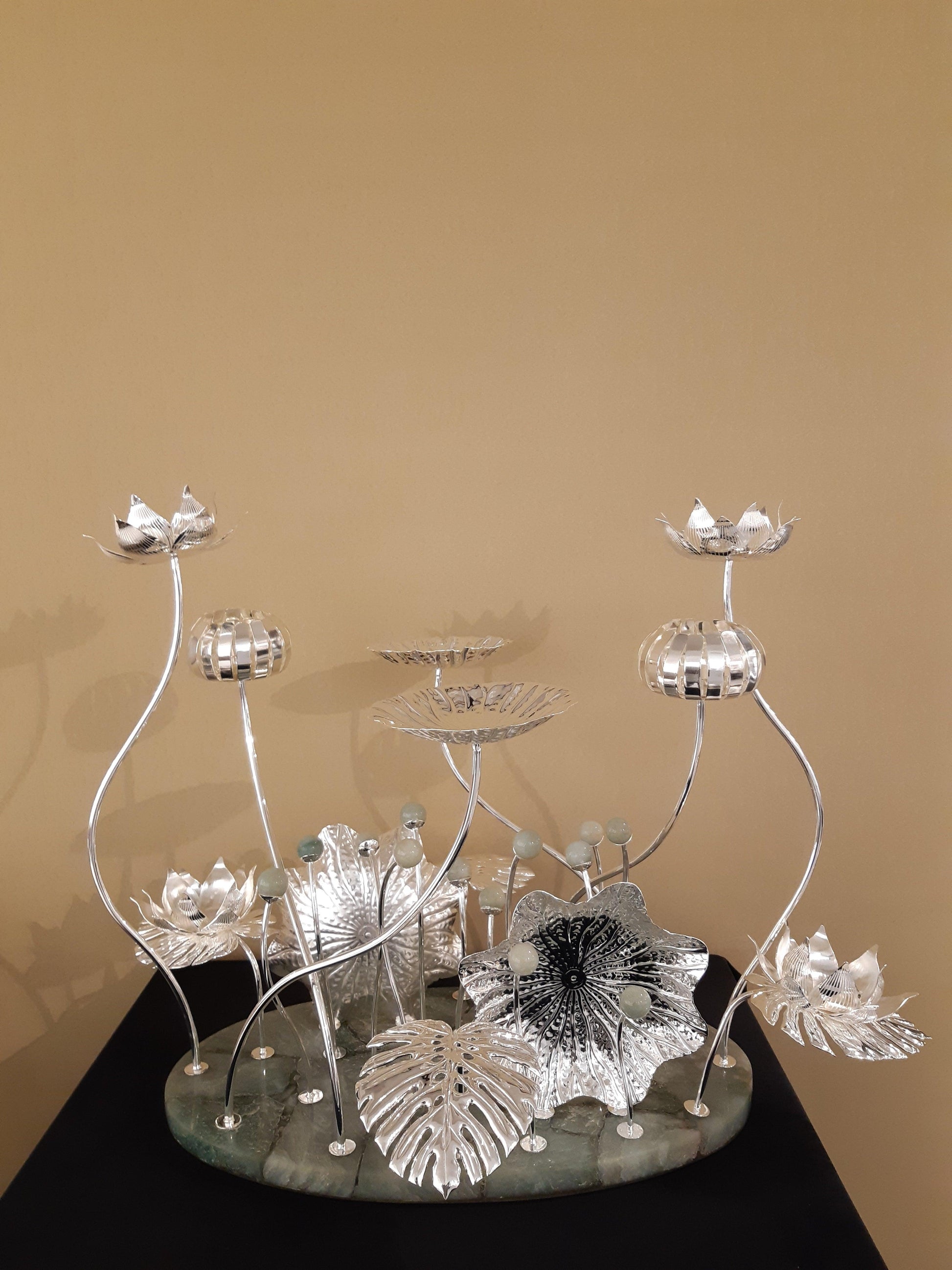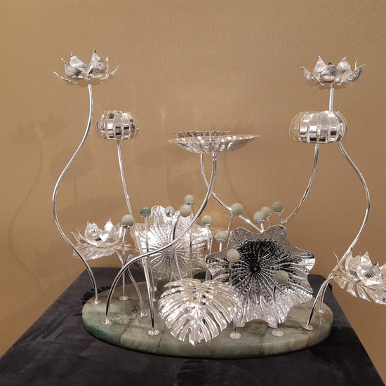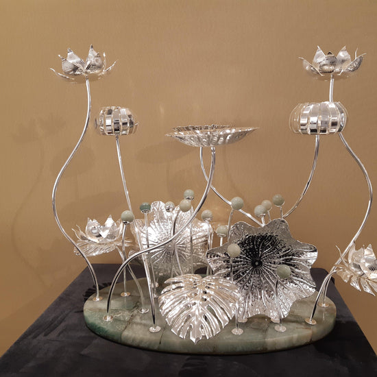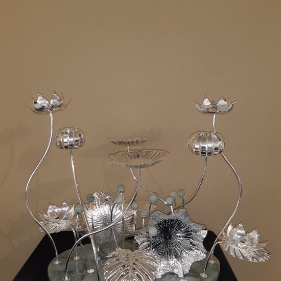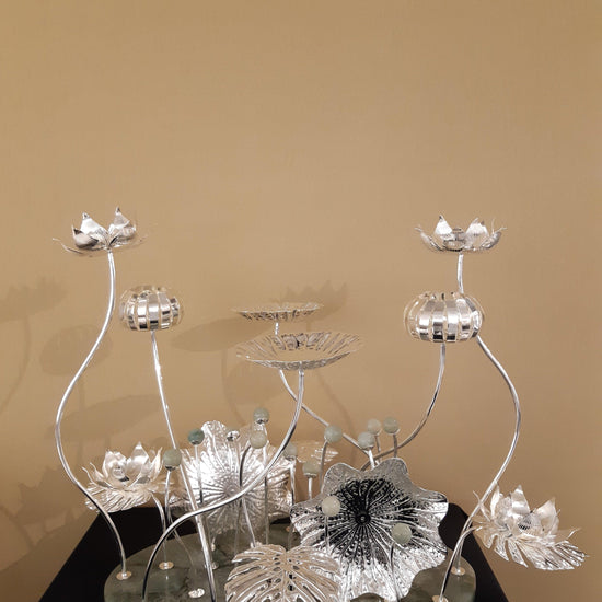The Big lotus Center piece you've described sounds like a beautiful addition to any home decor. Its combination of silver-plated brass and pink highlights adds a touch of elegance and tranquility to any space.