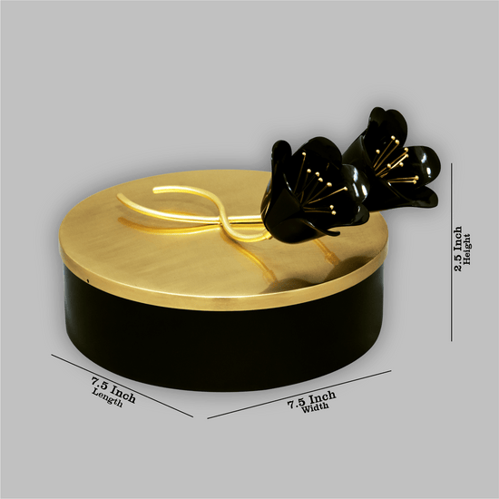 This black round box comes with a golden lid with two beautifully ornate black flowers on it. Perfect to store your belongings, or to gift on birthdays or anniversaries.