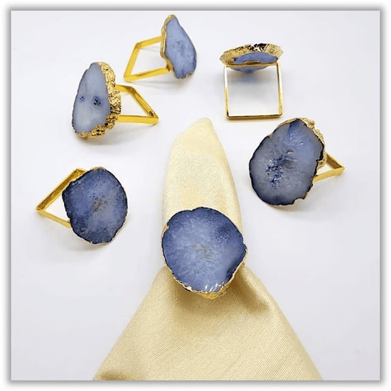 Add a touch of luxury to your table setting with our Blue Agate Napkin Ring Set. Made with precious and rare handcrafted agate, this set of 4 rings perfectly combines traditional craftsmanship with modern design. Each ring is carefully crafted with stone, ensuring a unique and elegant addition to any dining experience. Please note that the items displayed in the image are for display purposes only and are not included in the delivery. Product color may vary slightly due to photography lighting.