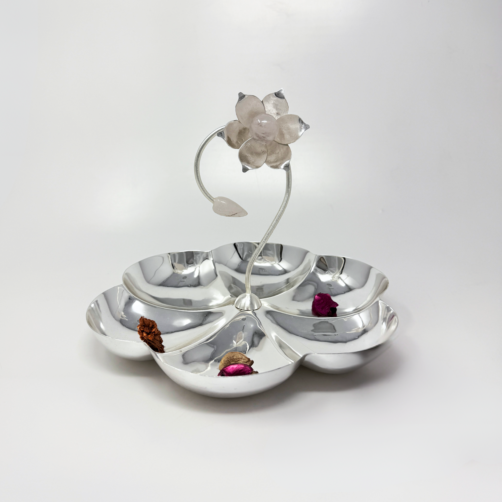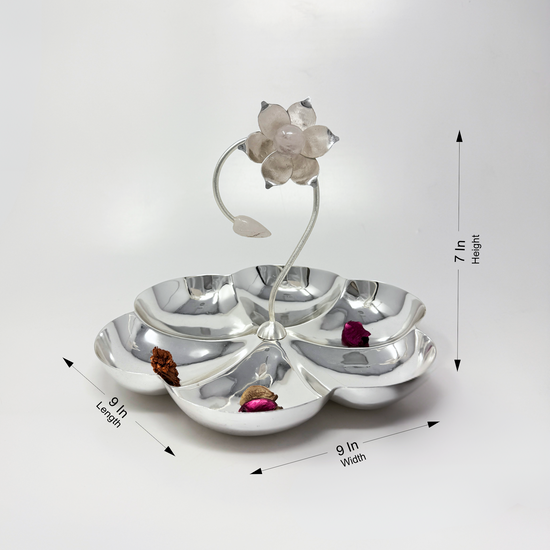 The platter features a delicately designed daffodil flower centerpiece rising gracefully from a petal-shaped base. Its shimmering finish and gemstone-like accents make it a true statement piece. Measuring 9 x 9 x 7 inches, it is both functional and decorative — perfect for serving dry fruits, sweets, or snacks, or simply displayed as an eye-catching centerpiece.