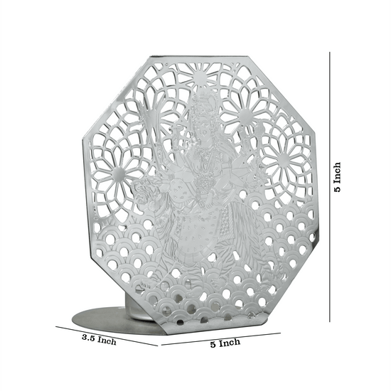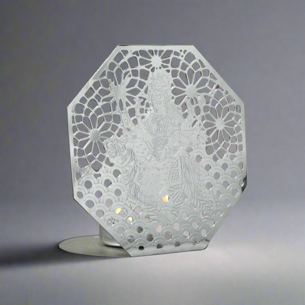 A cutwork tee light holder engraved with Durga Mata is a beautiful accent piece for gifting, or home décor. Use this in a spiritual corner in your home or office, to invoke the deity's blessings for protection, strength and courage. Makes a great house warming gift as well.