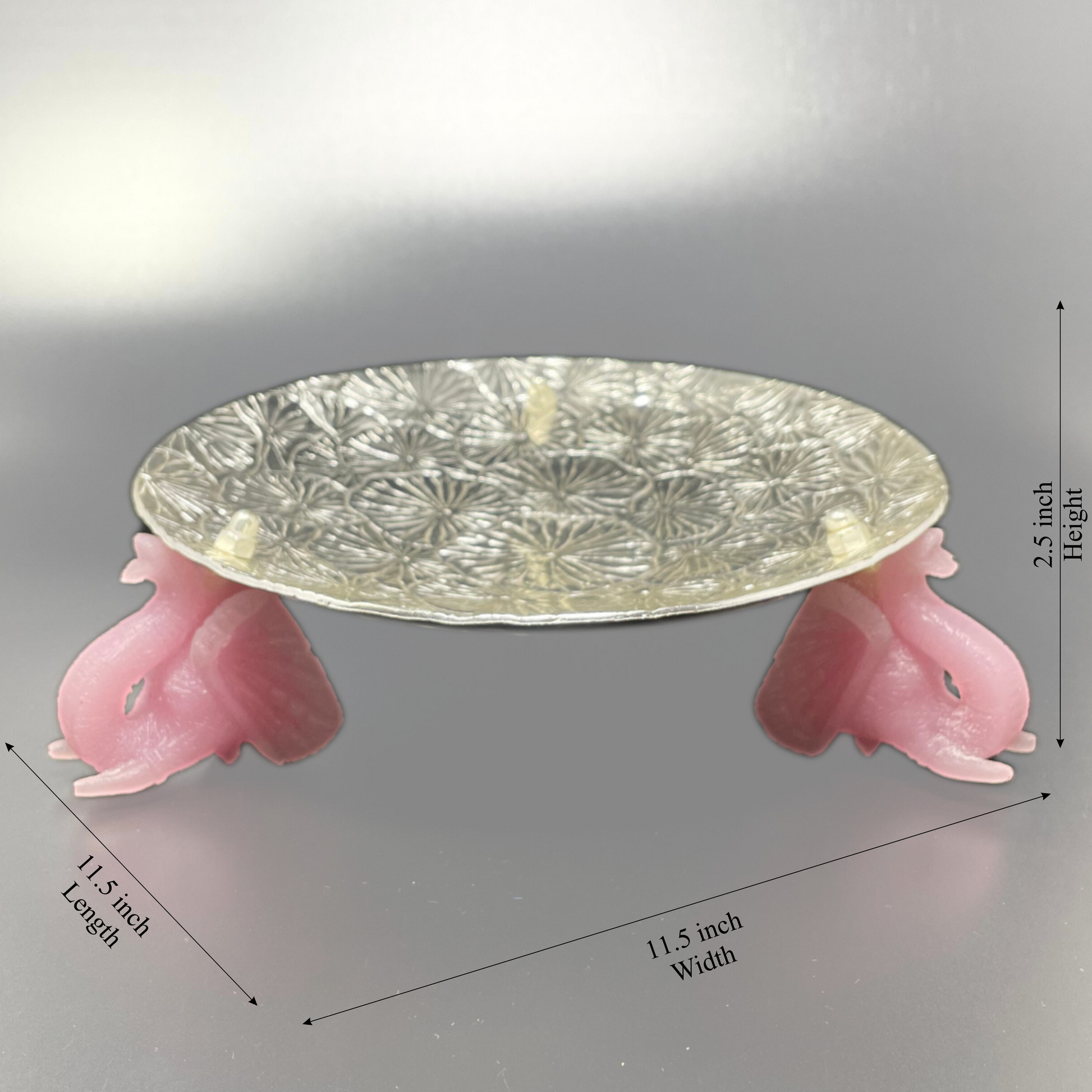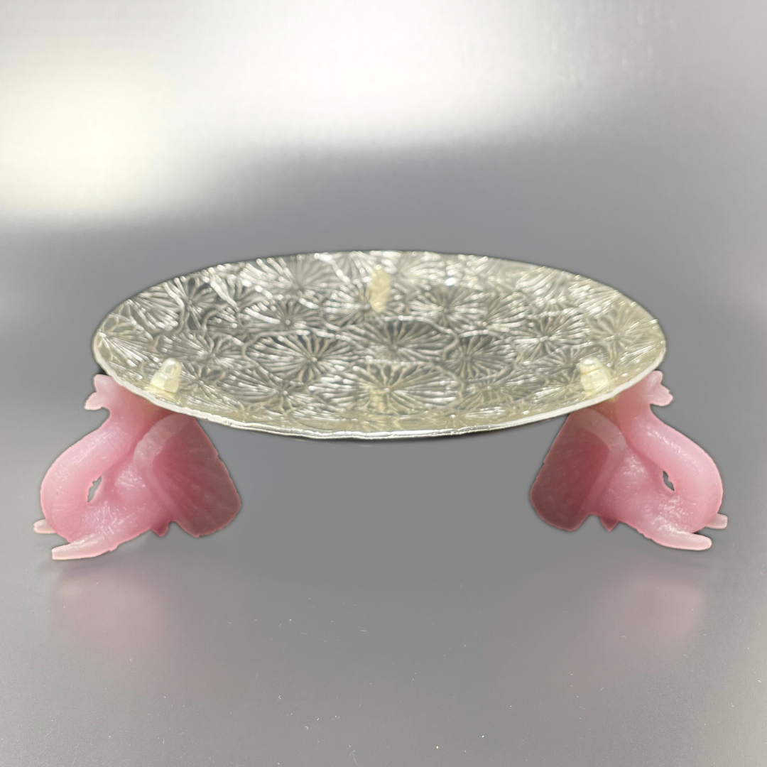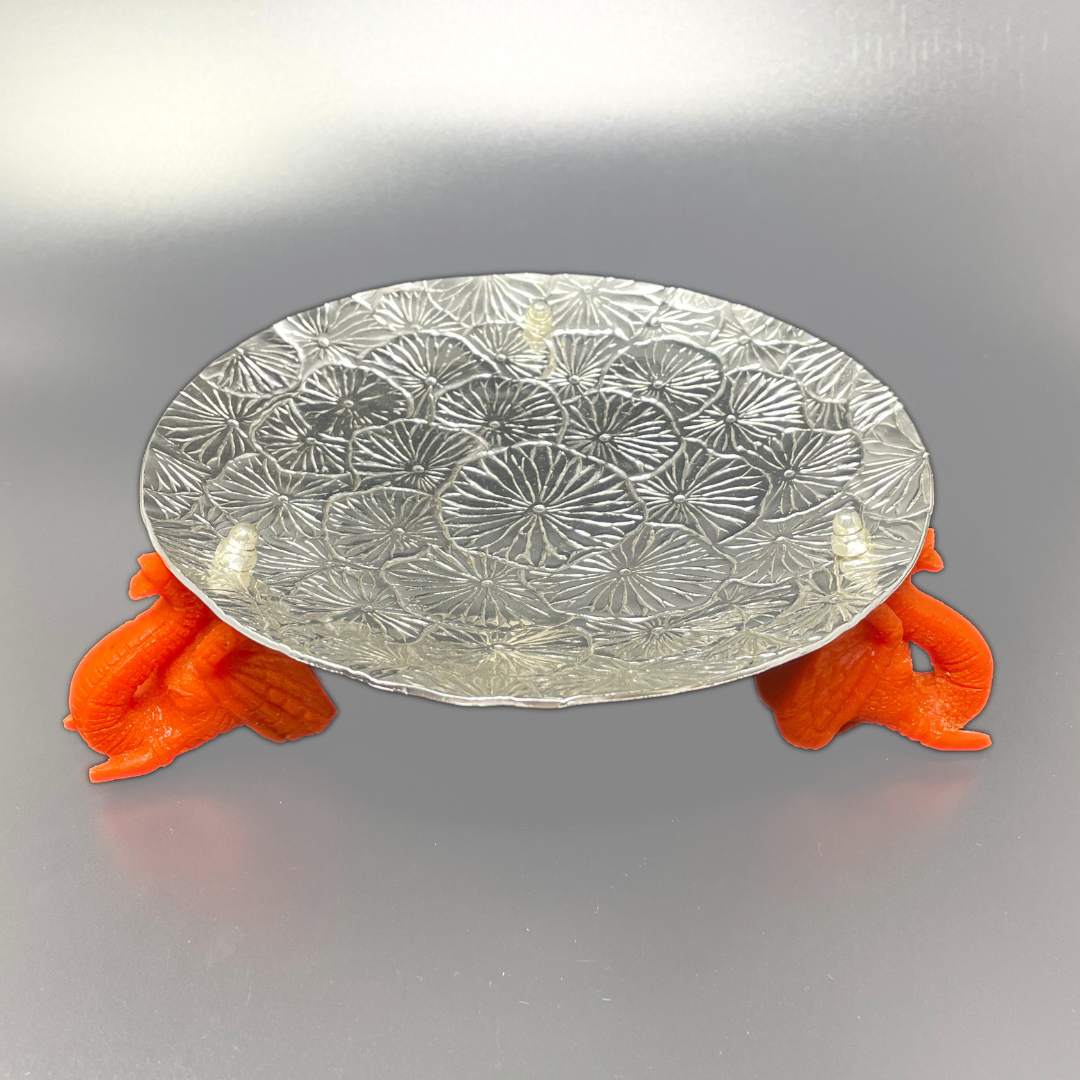 Crafted from brass with silver plating, this elephant trunk platter is a unique and elegant addition to any table setting. Impress guests with its intricate design and durable construction, perfect for serving appetizers or displaying decorative items. The resin elephant trunk adds a touch of realism and charm to this eye-catching piece.