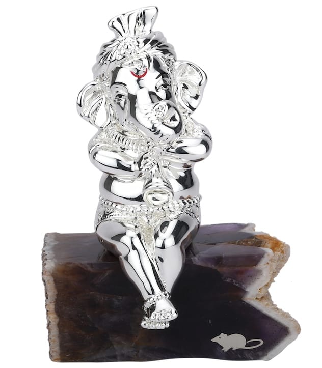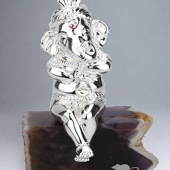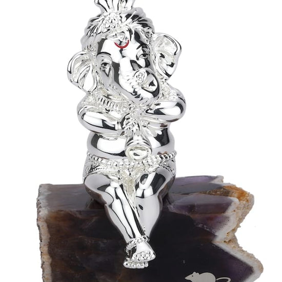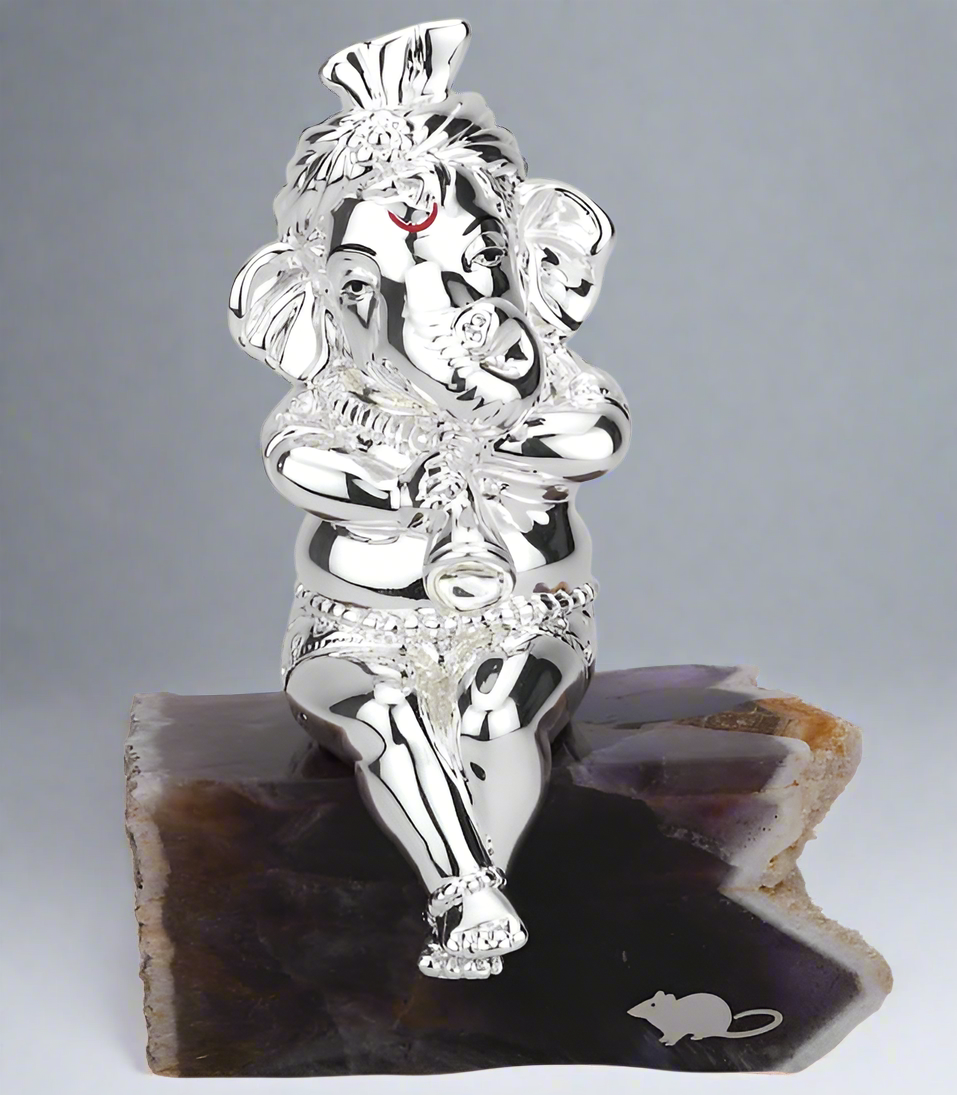 As an expertly crafted figurine, the Excited Shehnai Ganesha portrays the Hindu deity Ganesha in a dynamic and auspicious way. Made of bell metal and silver, this stylized piece stands at 8cmx14cm and features delicate carvings that add to its appeal. A perfect addition to any sacred space.