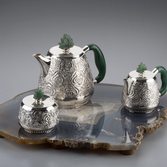 Flower Tea Set with Indian Jade Stone Handles Set of 3