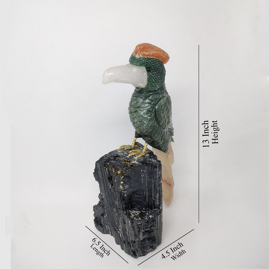 This Green Jade Bird sculpture on a Black Tourmaline base is a stunning addition to any room. The combination of the unique green jade stone and grounding black tourmaline provides a sense of balance and positive energy. Hand-carved by skilled artisans, this piece is truly one of a kind.
