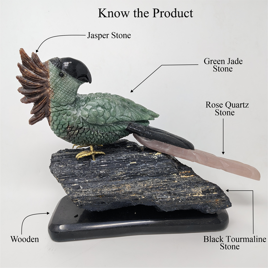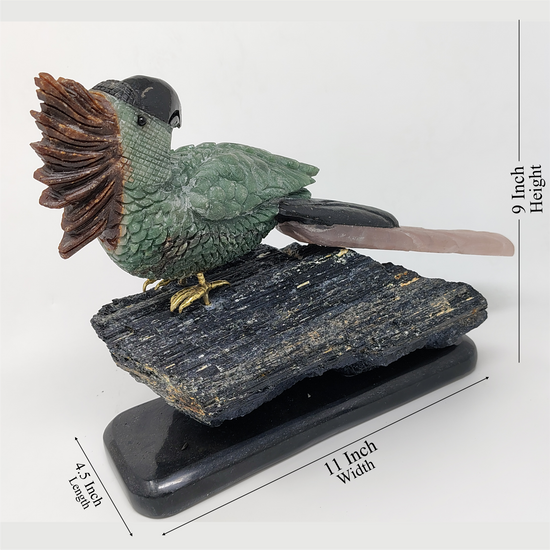 Enhance your home decor with a stunning Green Jade Parrot Perched on Tourmaline Gemstone. Crafted with high-quality Green Jade and Jasper Stone, this unique piece brings a touch of elegance and natural beauty to any room. The addition of Black Tourmaline adds a grounding element, making it the perfect accent for any space.