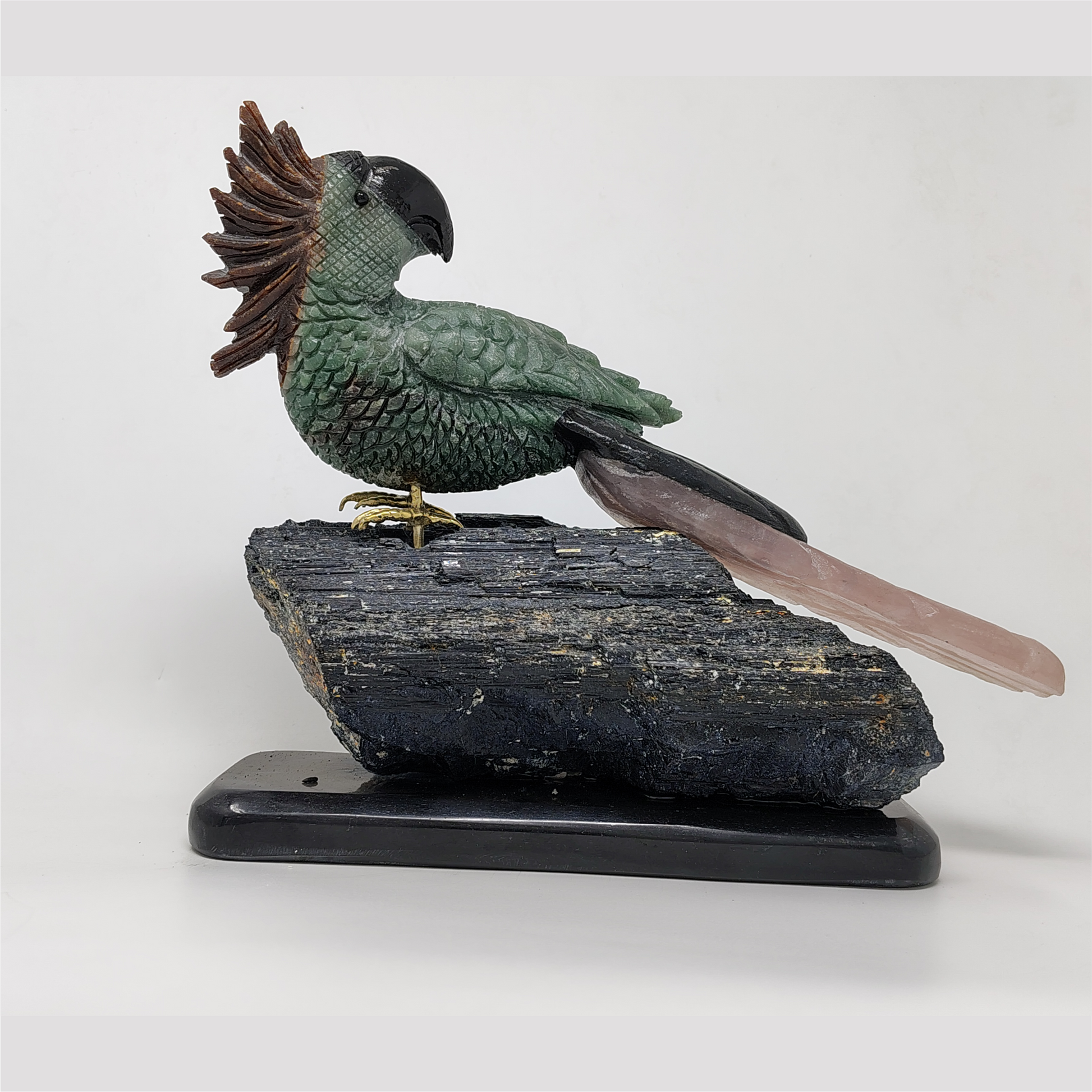 Green Jade Parrot Perched on Tourmaline Gemstone