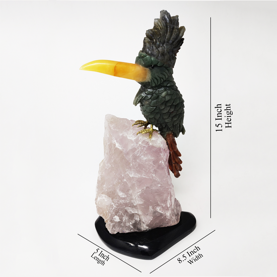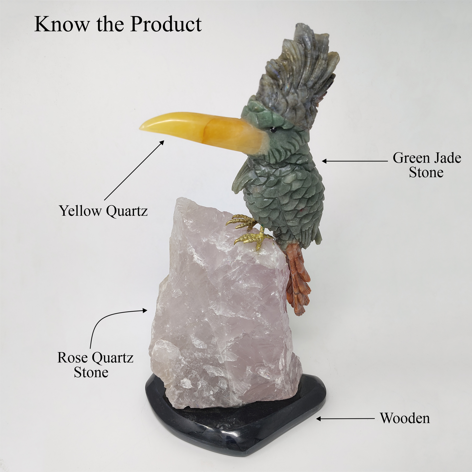 Expertly crafted from green jade and yellow quartz, these toucans perched on rose quartz showcase the natural beauty of these stones. Enhance your space with the tranquil energy of these unique bird sculptures.