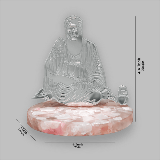 Crafted from high-quality brass with a gleaming silver plating, the Guru Nanak Showpiece is a stunning figure elegantly mounted on a base of rose quartz, exuding serene beauty. Ideal for placement in your car or on a table, it serves as both a spiritual symbol and an attractive decorative accent, enhancing your space with its exquisite presence.