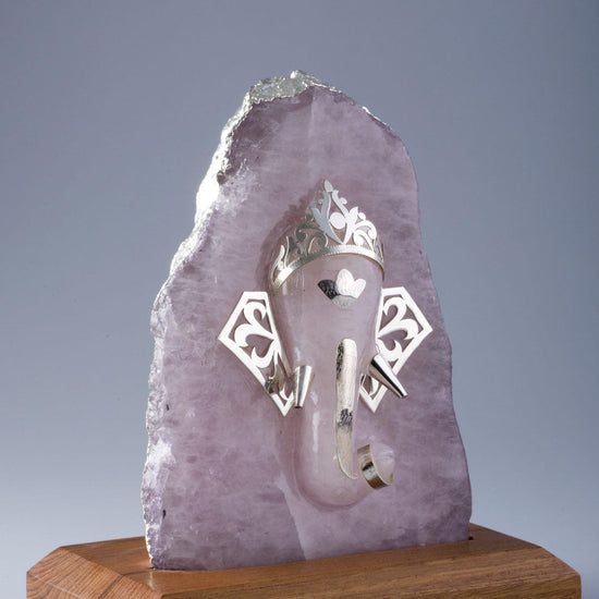 Hand Carved Rose Quartz Abstract Ganesha with Silver Jewellery