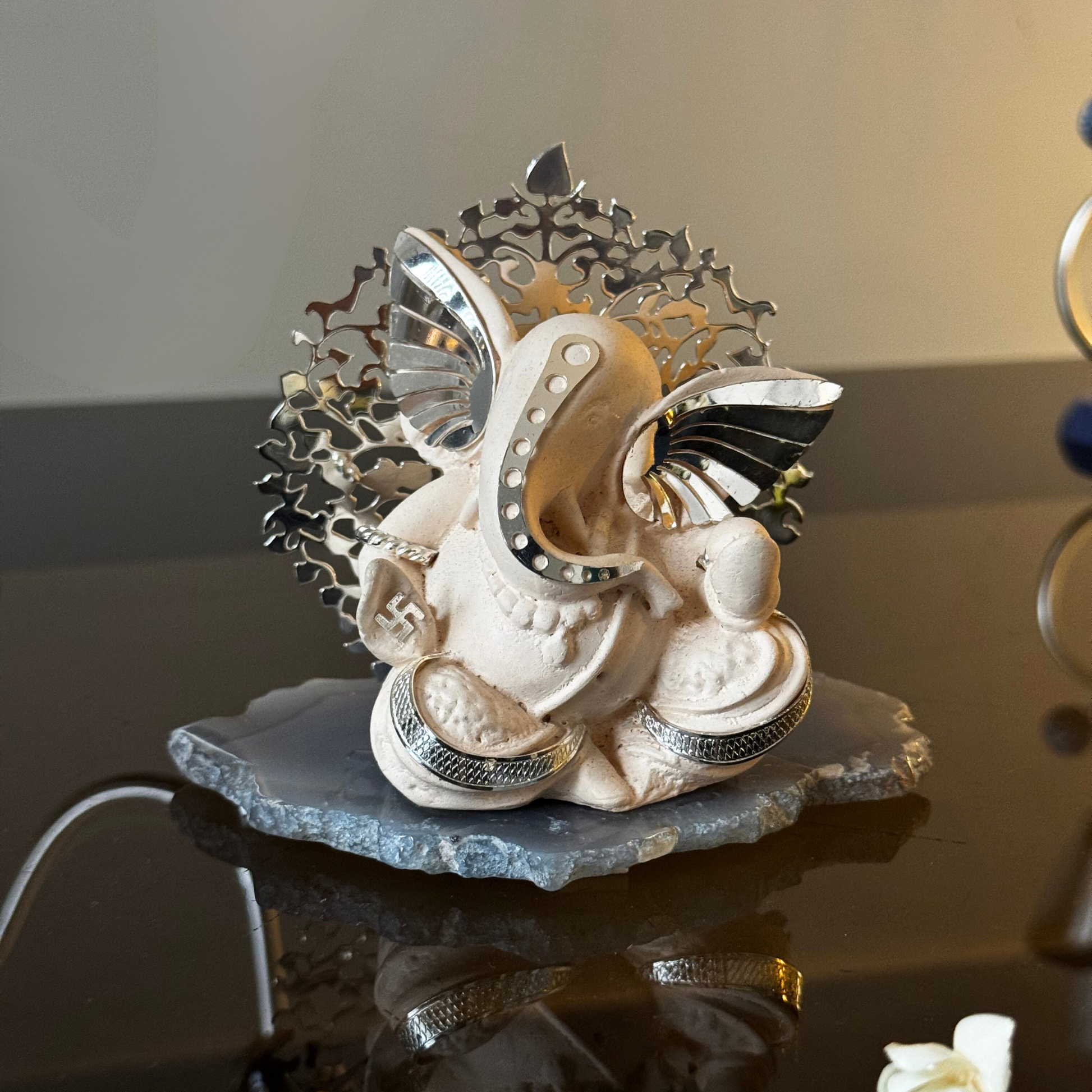 Create a serene ambiance with this ivory Lord Ganesha idol and Tree of Life figurine, meticulously crafted from resin and brass with silver plating. This thoughtfully created piece is believed to bring good fortune to your home and life.