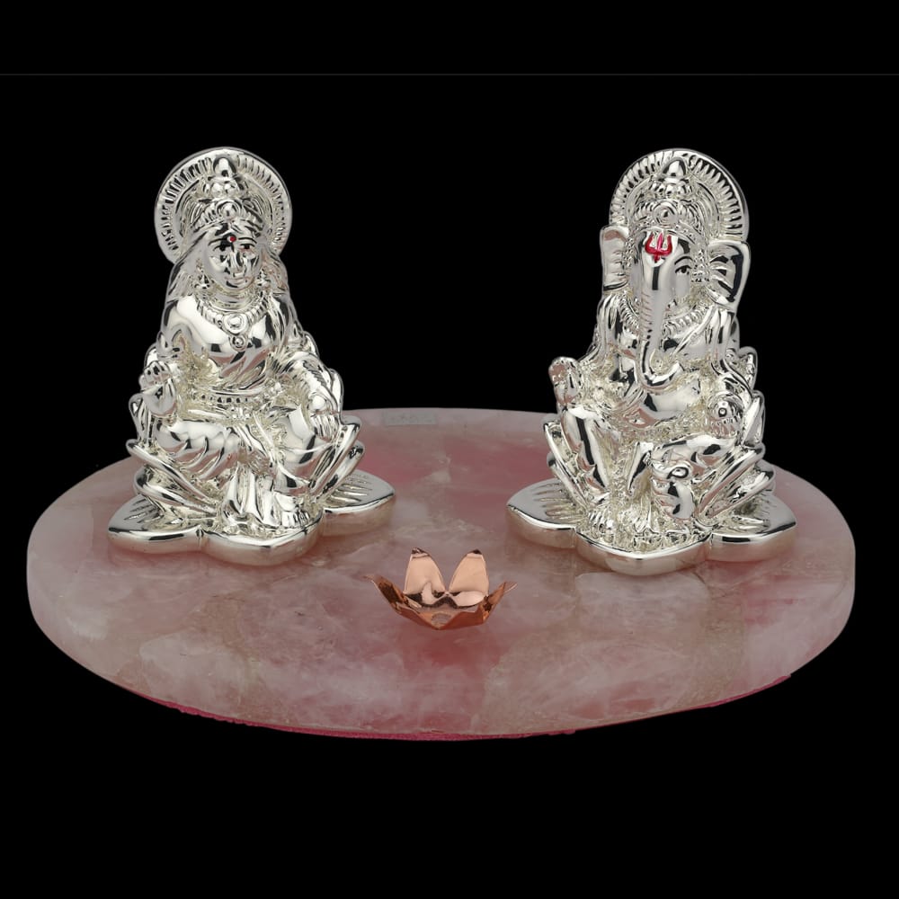 This Lakshmi Ganesha figurine is expertly crafted from pure 999 silver and mounted on a stunning rose quartz base. With its intricate detailing and high-quality materials, this piece is a timeless addition to any home. Celebrate traditional Hindu beliefs and bring a sense of peace and prosperity to any space with this beautiful figurine.