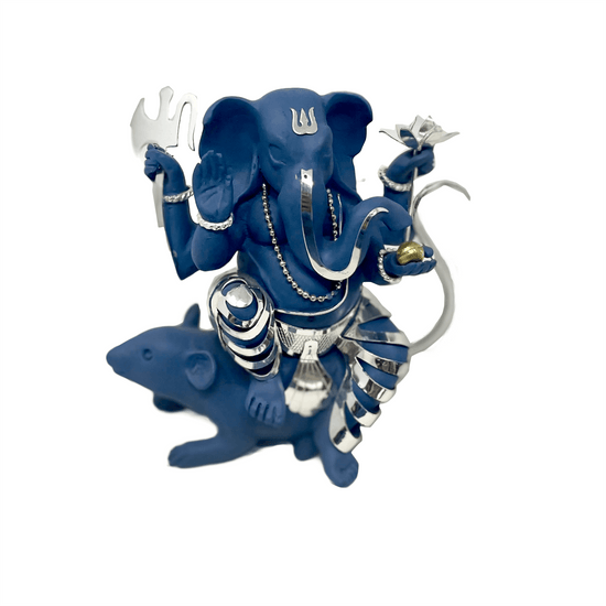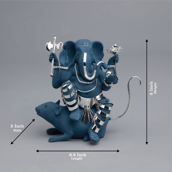 This gorgeous and unique silver Ganesh on a mouse features a poly resin blue-colored Ganesh adorned with silver-plated artistic highlights in an anti-tarnish finish. It is an ideal, one-of-a-kind artifact that will provide a lifetime of viewing pleasure. Purchase this elegant silver Ganesh on a mouse, heavily silver-plated and lacquered for an enduring and lasting finish.