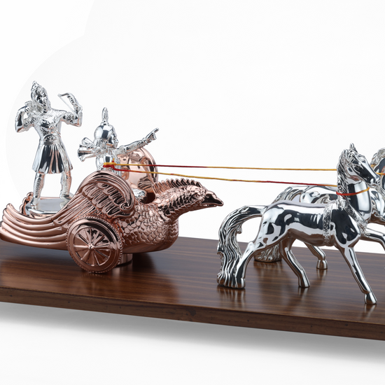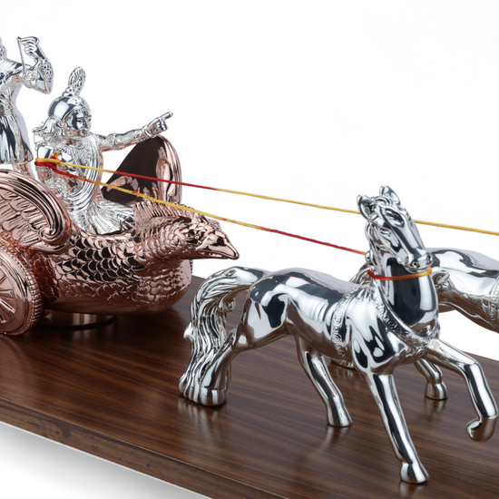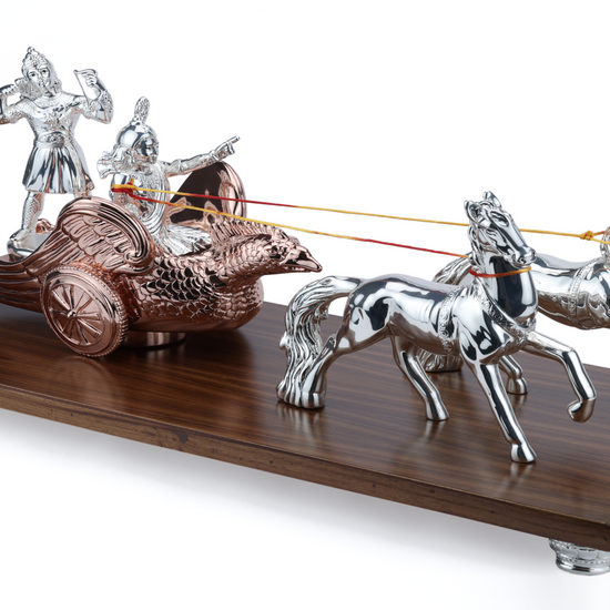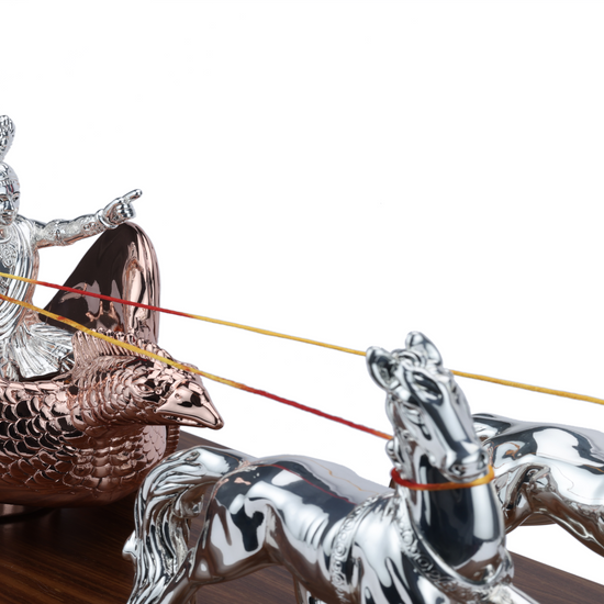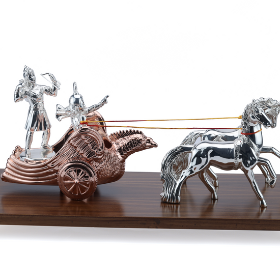 This Lord Krishna and Arjun Rath Chariot Horse is expertly crafted from pure 999 silver, ensuring its durability and elegant appearance. Displayed on a wooden base, this intricate piece showcases the rich cultural heritage of India and makes for a stunning addition to any home or office decor.