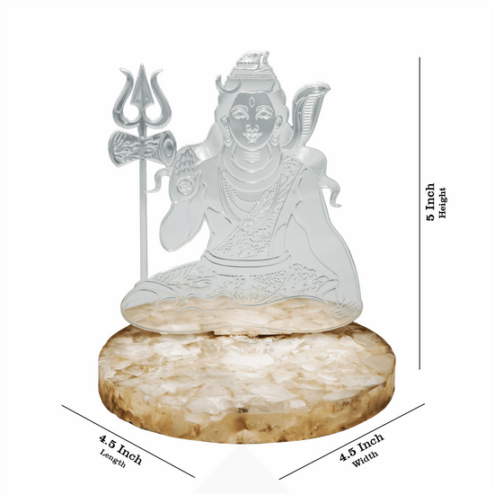 Lord Mahadev Showpiece, a stunning figure crafted from high-quality brass with a gleaming silver plating. Elegantly mounted on a base of rose quartz, this piece exudes a serene beauty. Ideal for placing in your car or on a table, it serves as both a spiritual symbol and an attractive decorative accent. Enhance your space with this exquisite Mahadev on a rose quartz base.