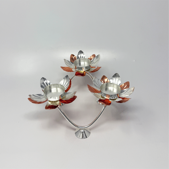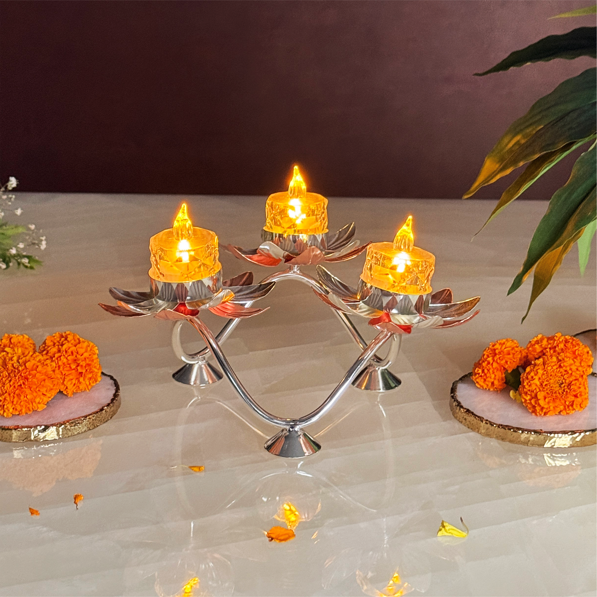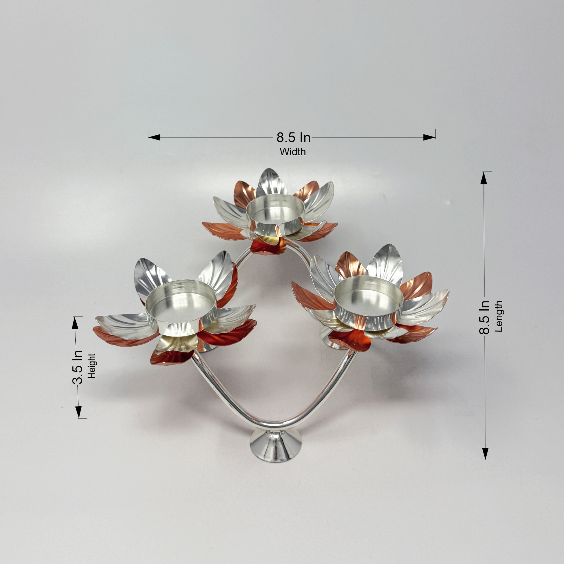 Elevate your decor with this Lotus Flower Tealight Holder crafted from premium steel with silver and gold plating. Designed to hold three tealights, its lotus-inspired petals radiate warmth and serenity, making it a perfect centerpiece for festivals, pooja, or home decor.