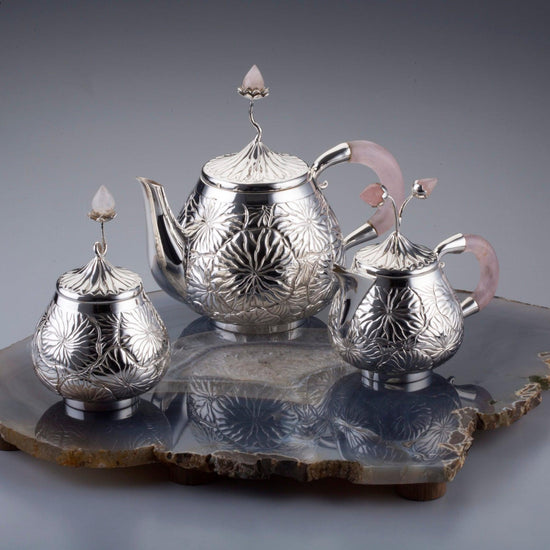 Lotus Leaf Tea Set with Rose Quartz Stone Handles