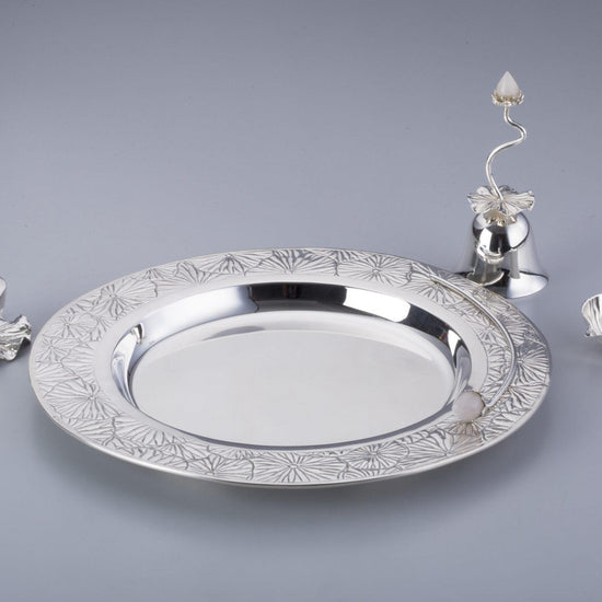 Lotus Puja Thali Set with Rose Quartz Bud Set of 4 Sterling Silver