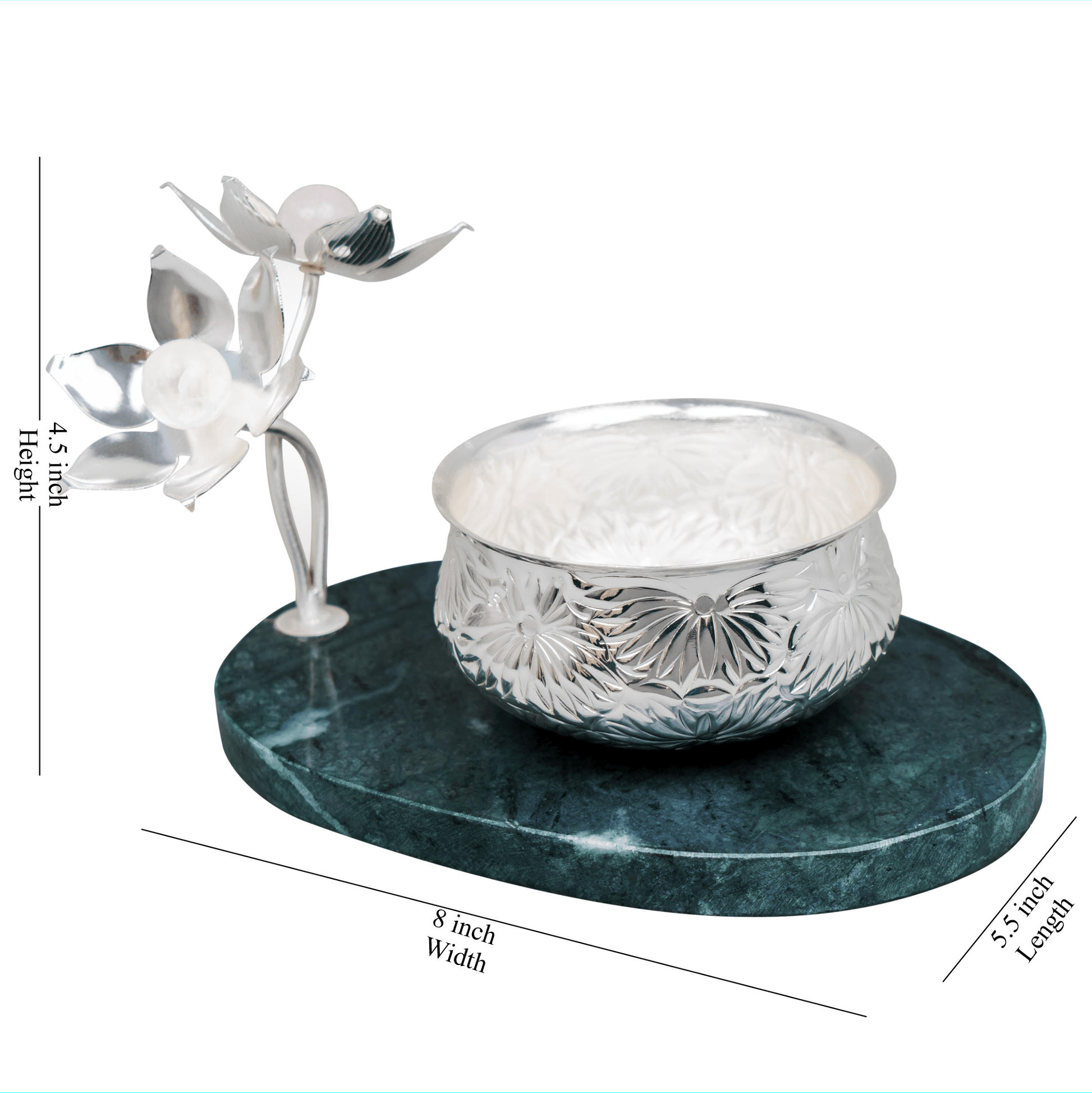 Enhance your decor with this exquisite Silver Plated Lotus Rippose Bowl, delicately adorned with a beautifully crafted flower. Resting gracefully on a luxurious marble base, this piece combines timeless elegance with contemporary sophistication. Perfect for adding a touch of refinement to any room, it is ideal for holding potpourri, fruit, or simply serving as a stunning standalone accent. Crafted with attention to detail, this bowl is a testament to superior craftsmanship and enduring beauty.