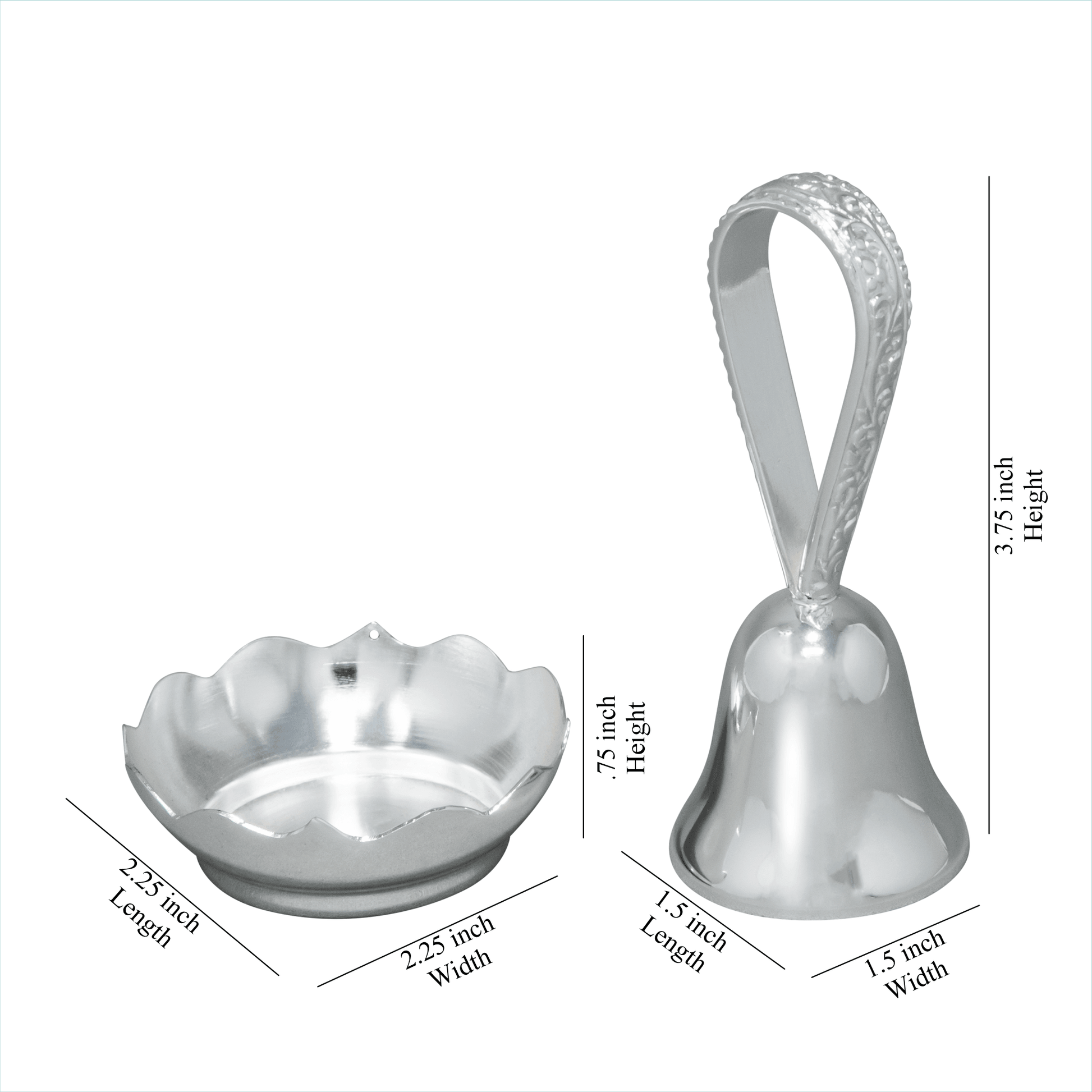 Cast away negativity and ring in a serene ambiance with this auspicious pair of Silver Plated Bell and Diya. Discover the perfect union of tradition and sophistication with the classic silver-plated Diya and Bell Set. The timeless lotus-shaped diya, plated in silver with a glossy texture, and a bell with intricate embossed designs captivate with their aesthetic appeal and spiritual significance... perfectly complementing your pooja thali! Whether gracing your pooja room daily or adorning your home during festive occasions, this Diya paired with a bell, designed to ward off negativity, is a harmonious blend of elegance and spirituality. Embrace the gleaming silver hues and usher in a sense of purity and serenity into your space with this classic Diya and bell ensemble.