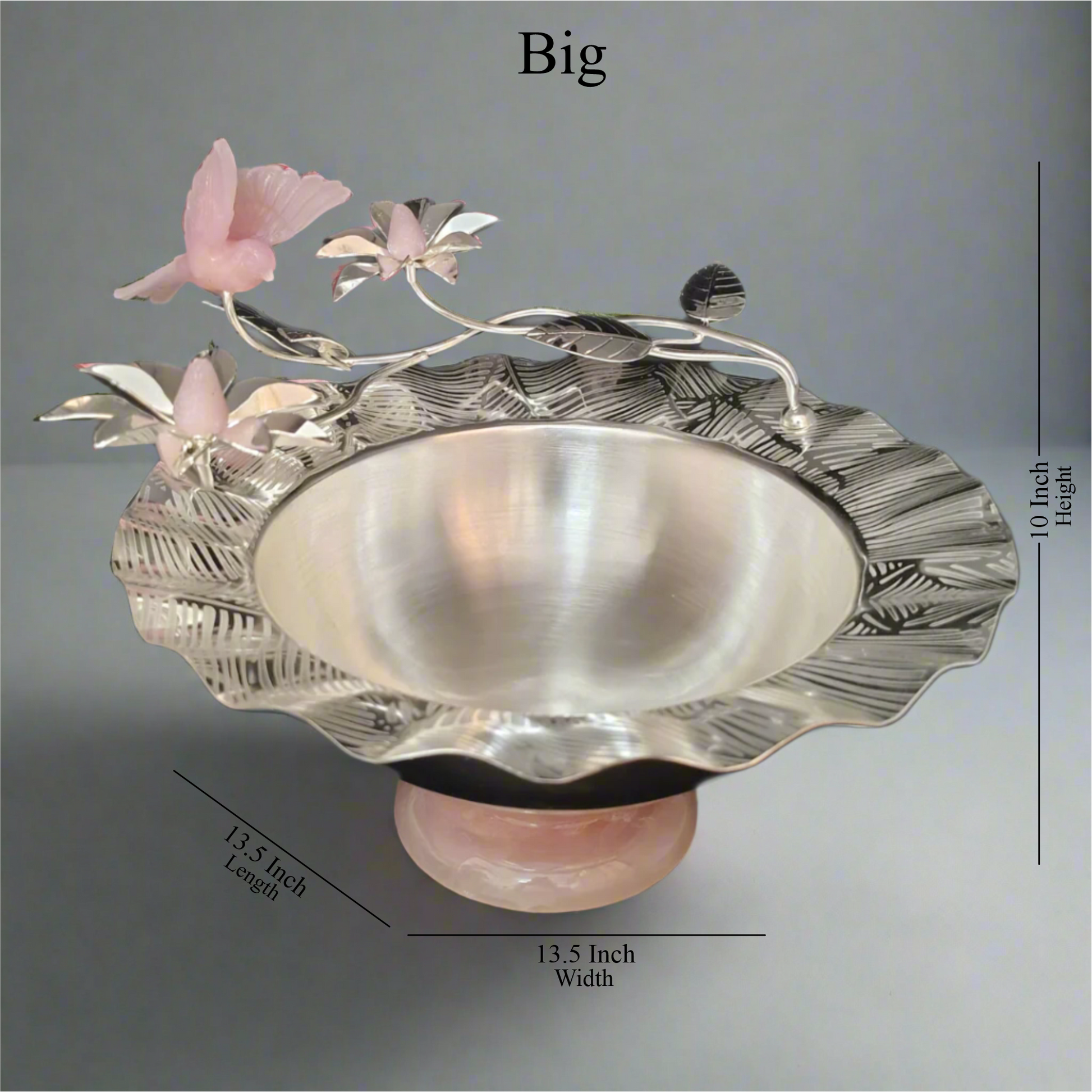 This elegant Magnolia Flower bowl features a delicate Pink Flying Bird, crafted from brass and silver plating. The bowl's detailed design adds a touch of sophistication to any room, while the Pink Flying Bird brings a pop of color. Perfect for adding a touch of nature to your decor.