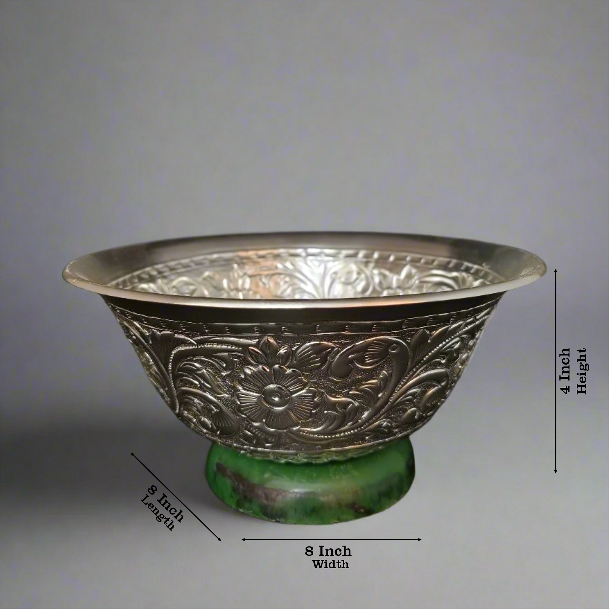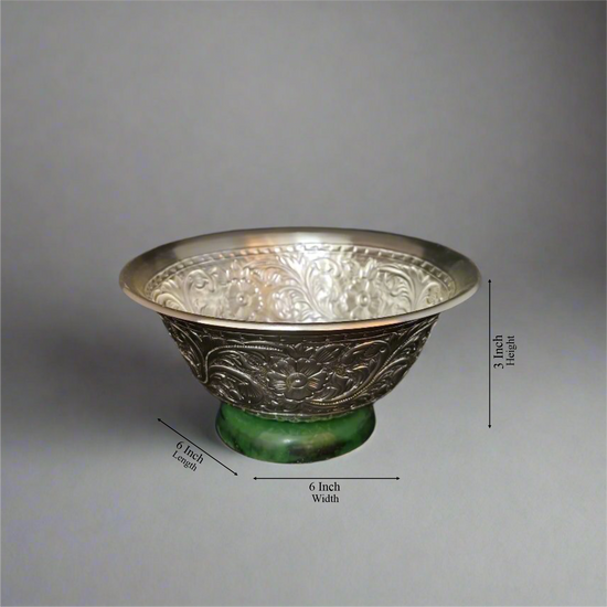 Crafted from bass with silver plating, the Nakshi bowl with base offers an elegant addition to any decor. With its intricate design and unique green resin base, this bowl is sure to impress. Showcase your style and taste with this exquisite piece.