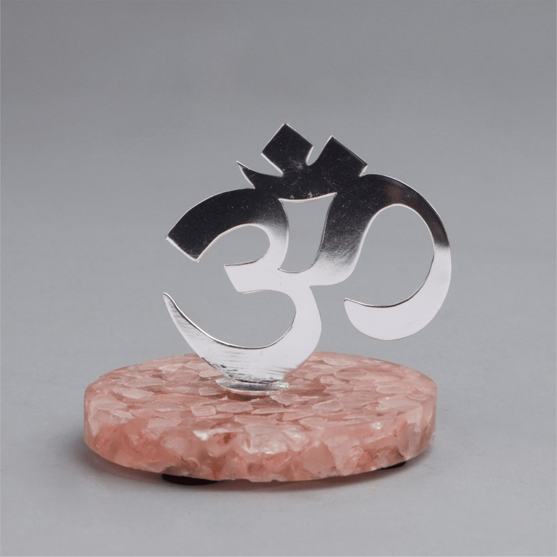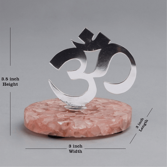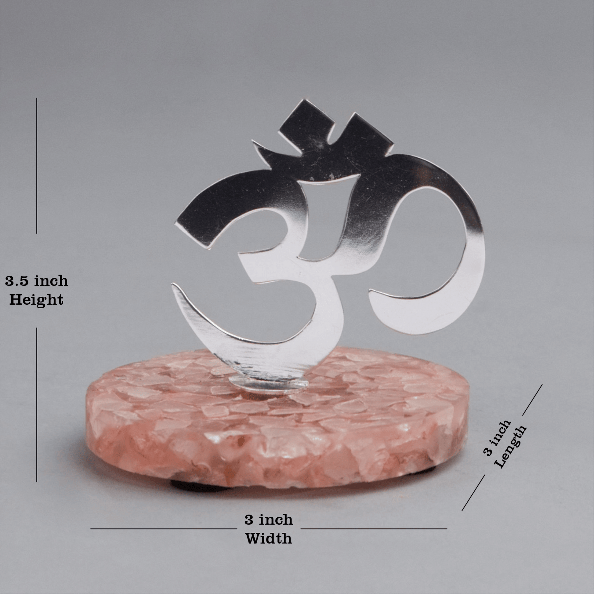 A symbol of spirituality and serenity, this exquisite silver brass Om cutwork on a rose quartz base is a perfect gift for corporate events, housewarming, and various other special occasions