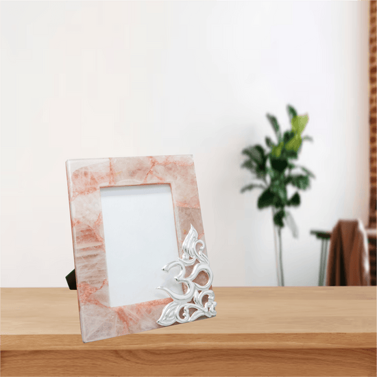Elevate your space with this exquisite Om-inspired photo frame crafted from delicate rose quartz and adorned with elegant silver plating. This stunning piece seamlessly blends spirituality and sophistication, offering a serene backdrop for your cherished memories. Bring harmony and beauty into your home or office with this timeless treasure, perfect for displaying your most precious moments with a touch of tranquility.