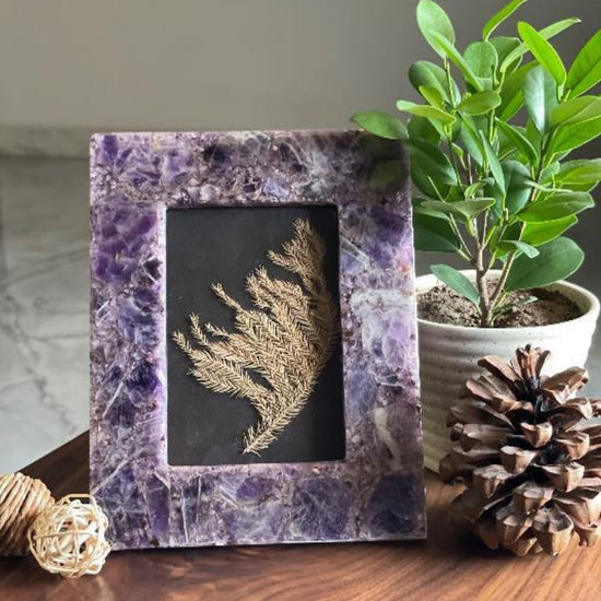 Enhance your home decor with the exquisite Purple Amethyst Photo frame. Crafted with precision, this frame features stunning purple amethyst gems that add a touch of elegance to any room. Display your favorite memories with style and sophistication. Perfect for adding a pop of color to your living space.