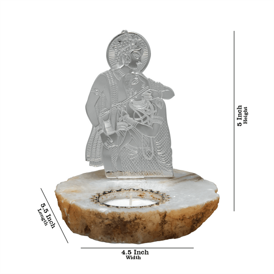 Experience divine grace and elegance with Radha Krishna Ji Tea ligh on Agate Stone Base. Crafted from high-quality brass and adorned with a gleaming silver plating, this exquisite piece combines spirituality and artistry. The natural beauty of the agate stone base enhances the sacred presence of Radha Krishna Ji, making it a perfect addition to your home or altar. Illuminate your space with devotion and style.