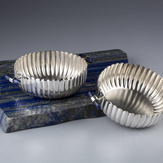 Ribbed Nut Bowls with Lapiz Stone Handles Set of 2 Sterling Silver