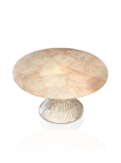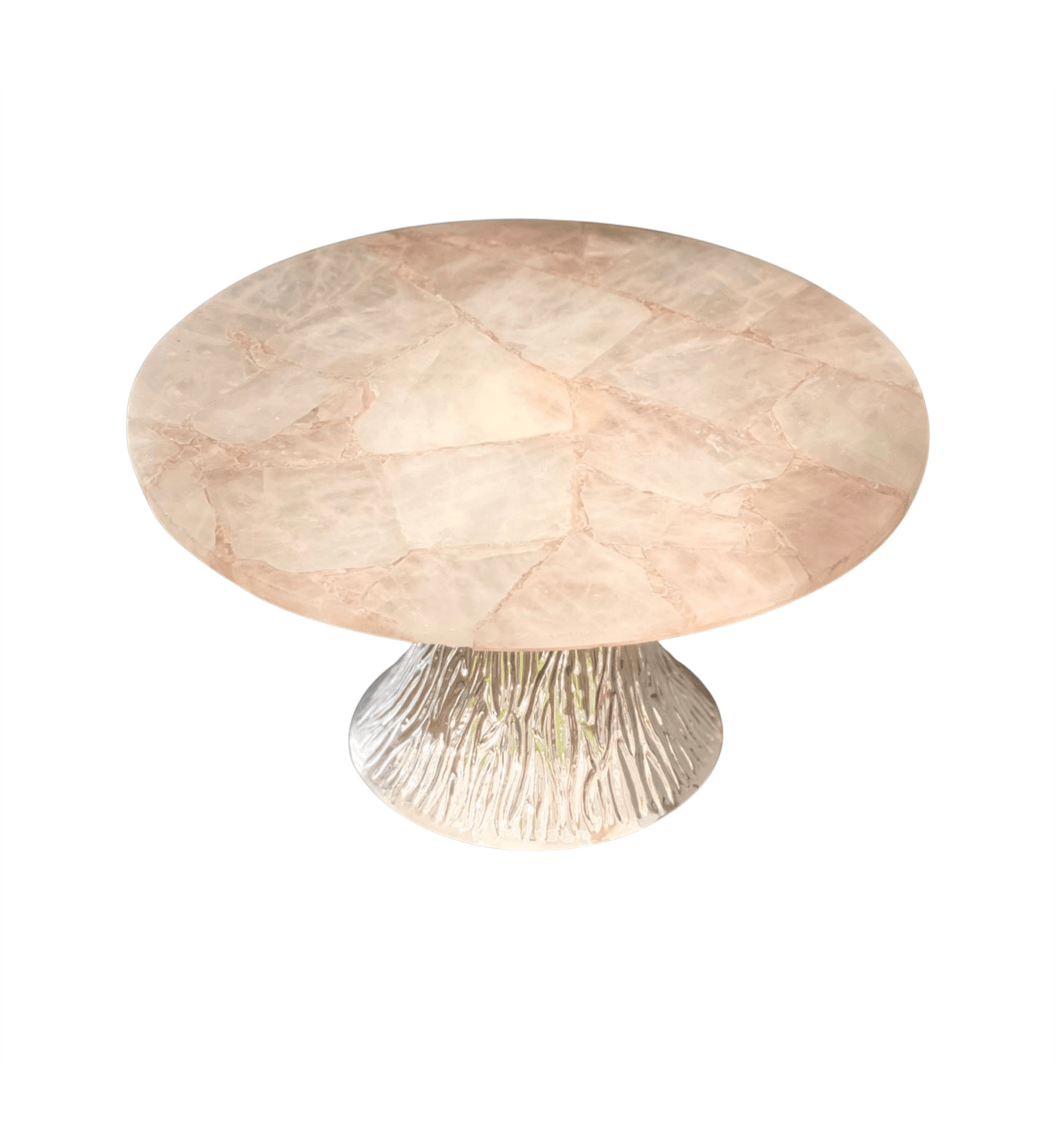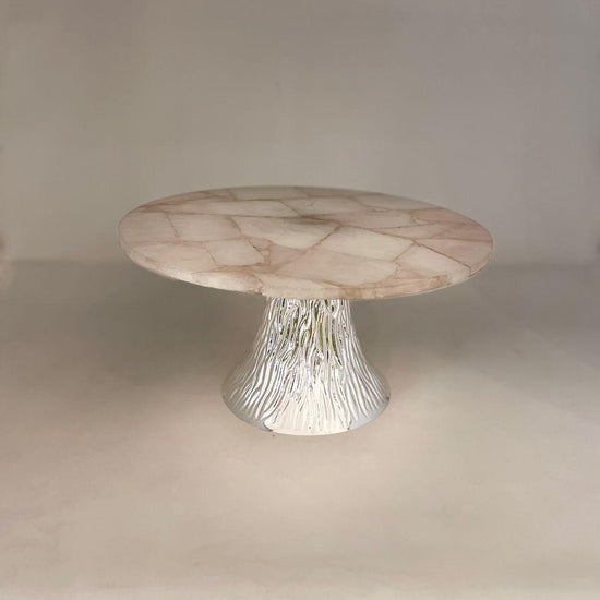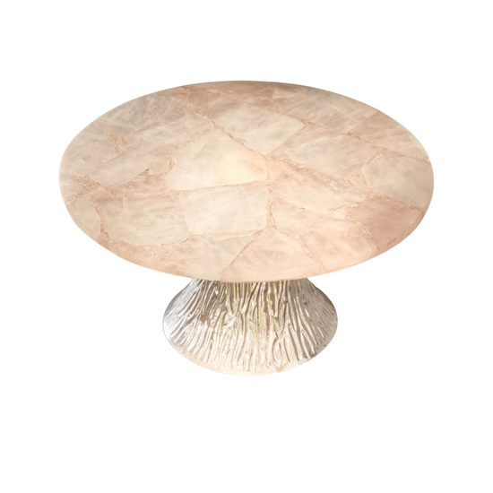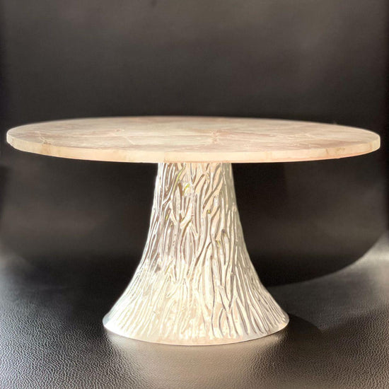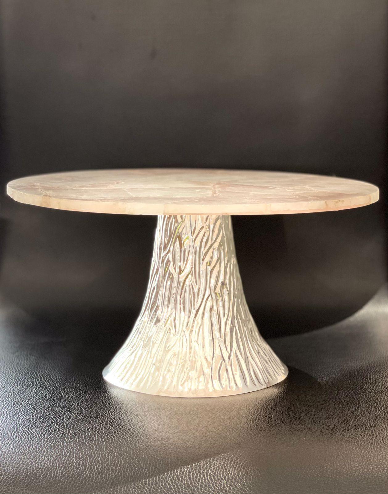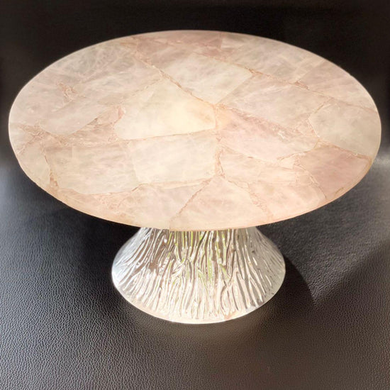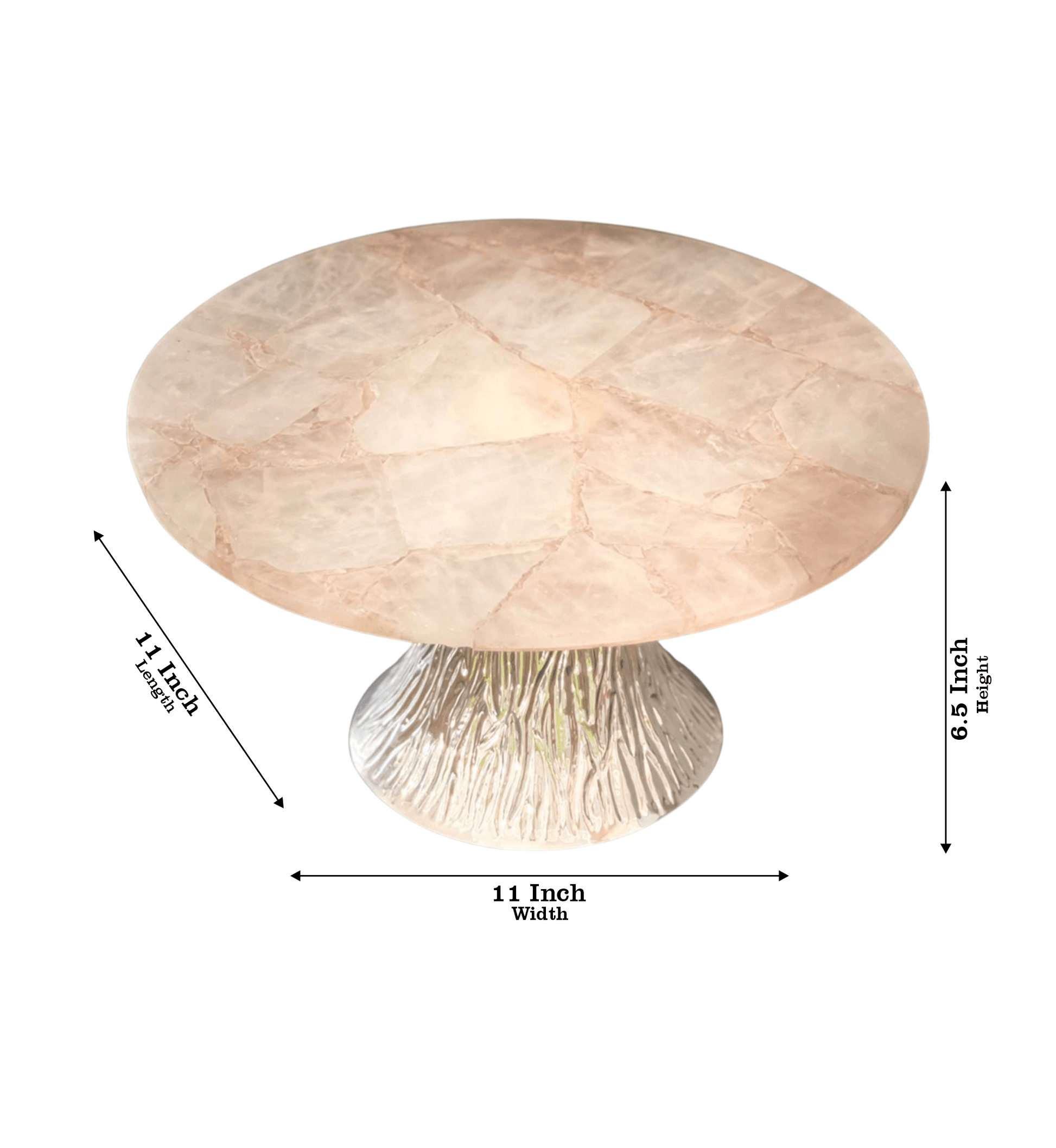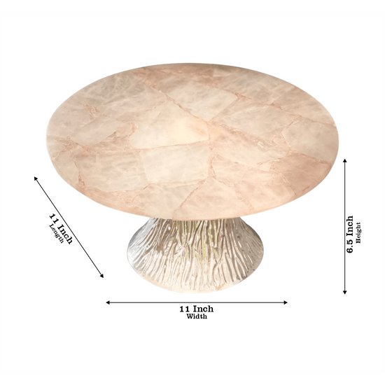 Elevate your table setting with this Roots Collection Cake Platter. This stunning round plate is crafted from exquisite rose quartz stone, beautifully complemented by a base of brass with silver plating. Perfect for showcasing your favorite desserts with a touch of elegance and sophistication.