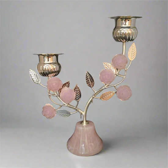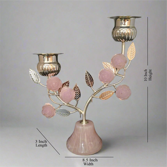 This elegant rose candle stand is expertly crafted from brass and plated in silver for a luxurious touch. The intricate rose design, made from pink resin, adds a touch of romance to any room. Perfect for adding a warm ambiance and stylish décor to any occasion.
