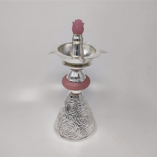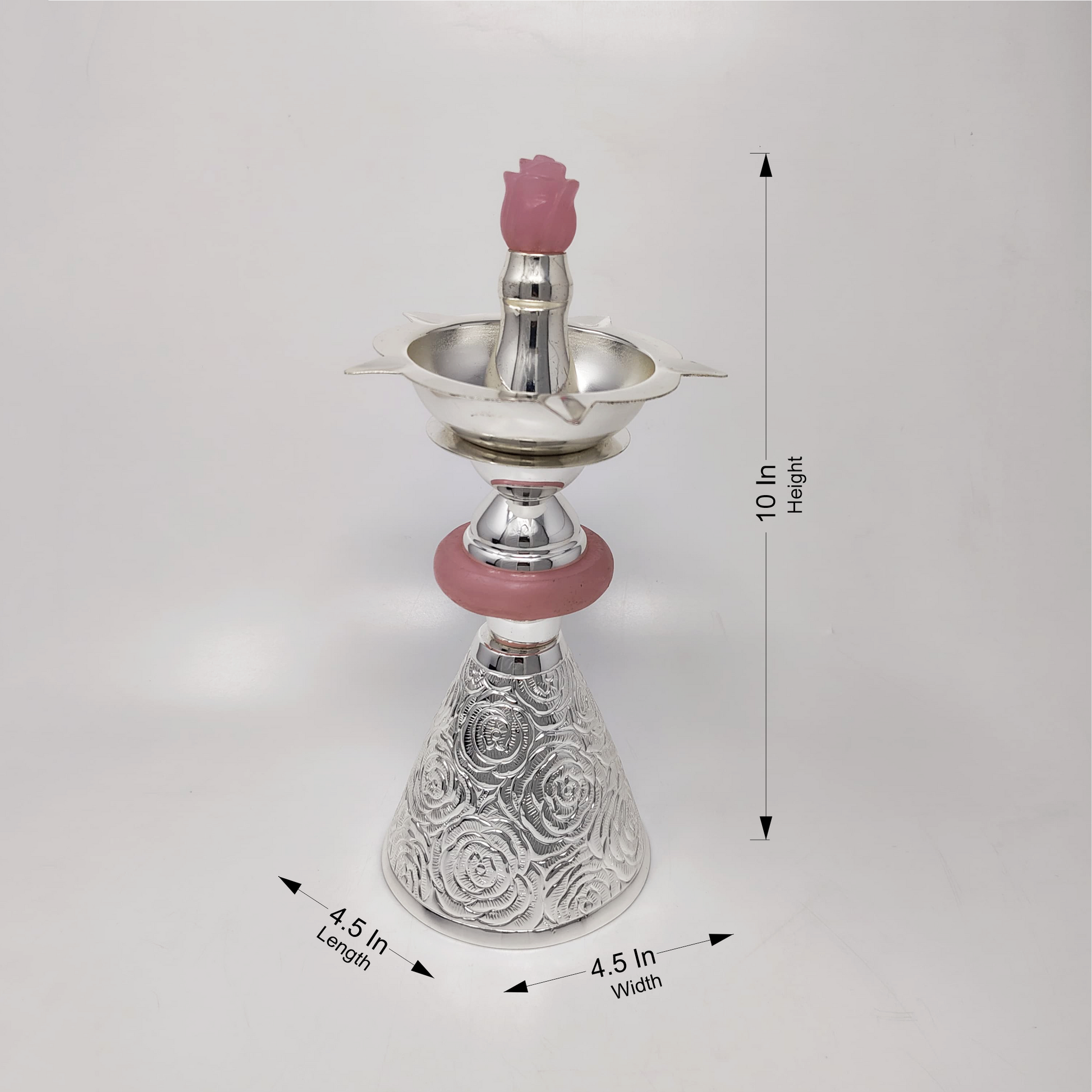 Bring timeless elegance and divine charm into your home with this Rose Embossed Samai. Expertly handcrafted from premium brass with silver plating, this traditional lamp embodies the perfect blend of heritage and artistry. The intricate rose embossing across its conical base adds a touch of sophistication, while the pink resin knob on top enhances its beauty with a contemporary accent.
