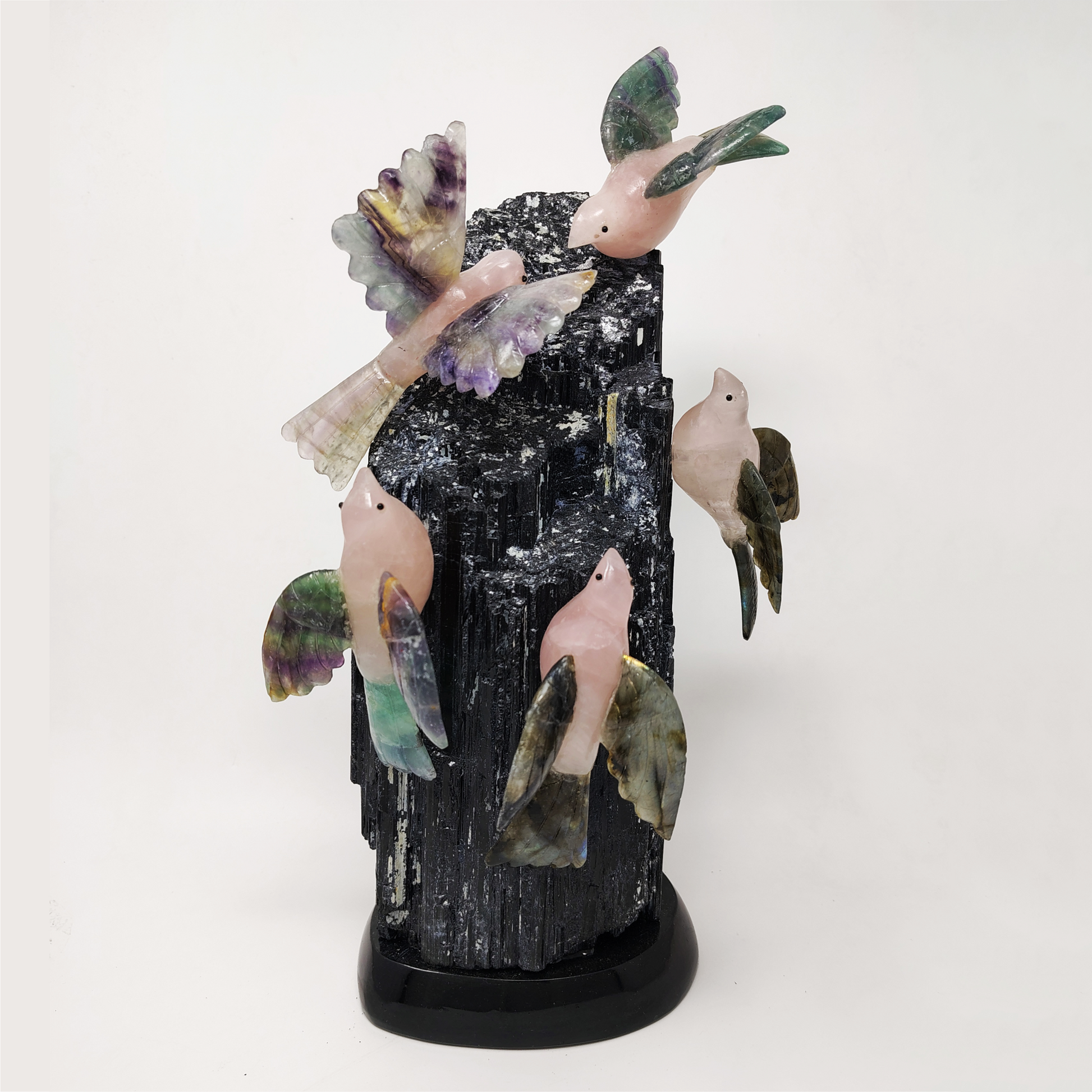 Rose Quartz Birds Figurines on Black Tourmaline Stone