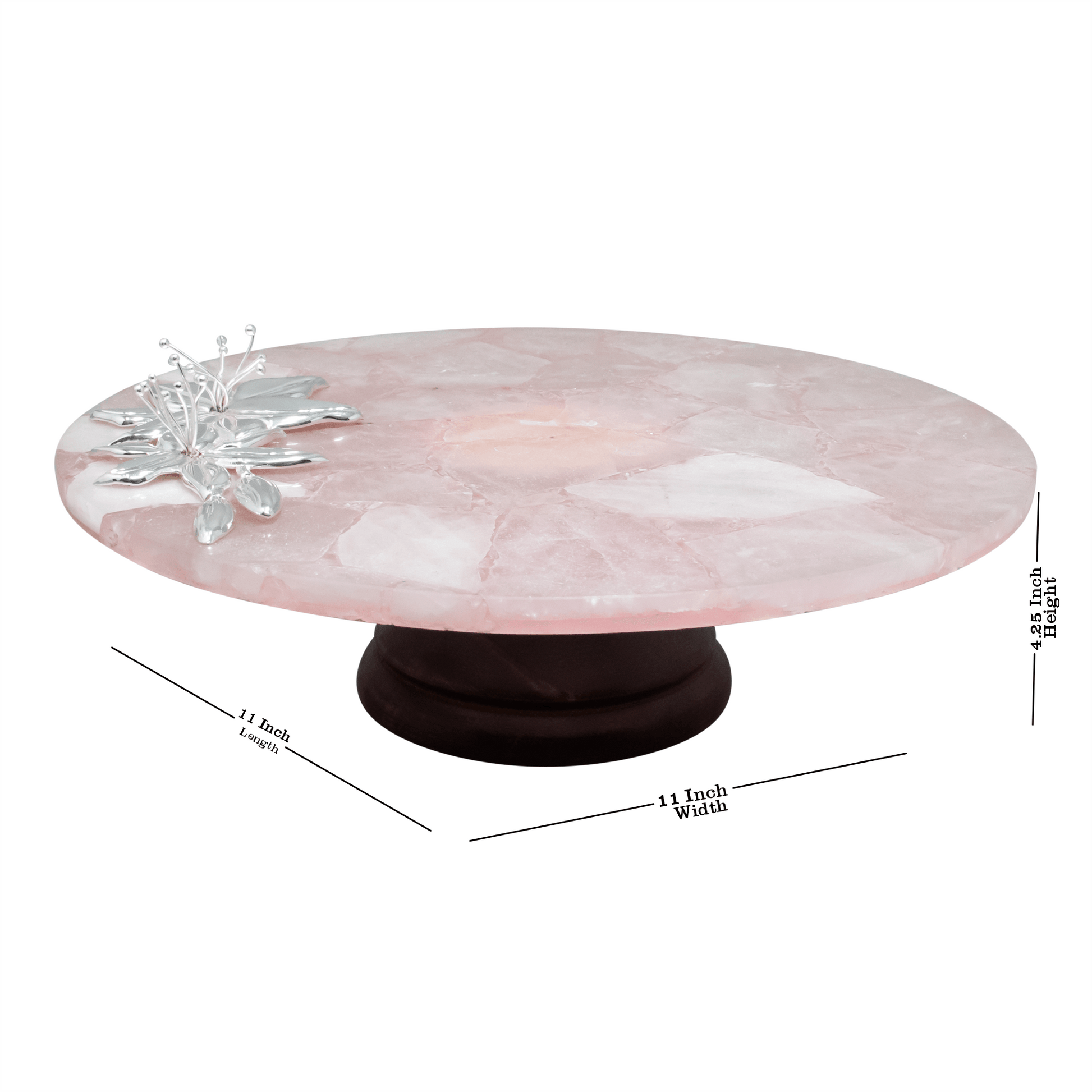 Elevate your cake presentation with this Rose Quartz Flower Round Cake Platter. This stunning piece features a luxurious brass flower with silver plating, adding a touch of elegance to any occasion. Complete with a sturdy wood base, it's the perfect centerpiece for your next celebration.