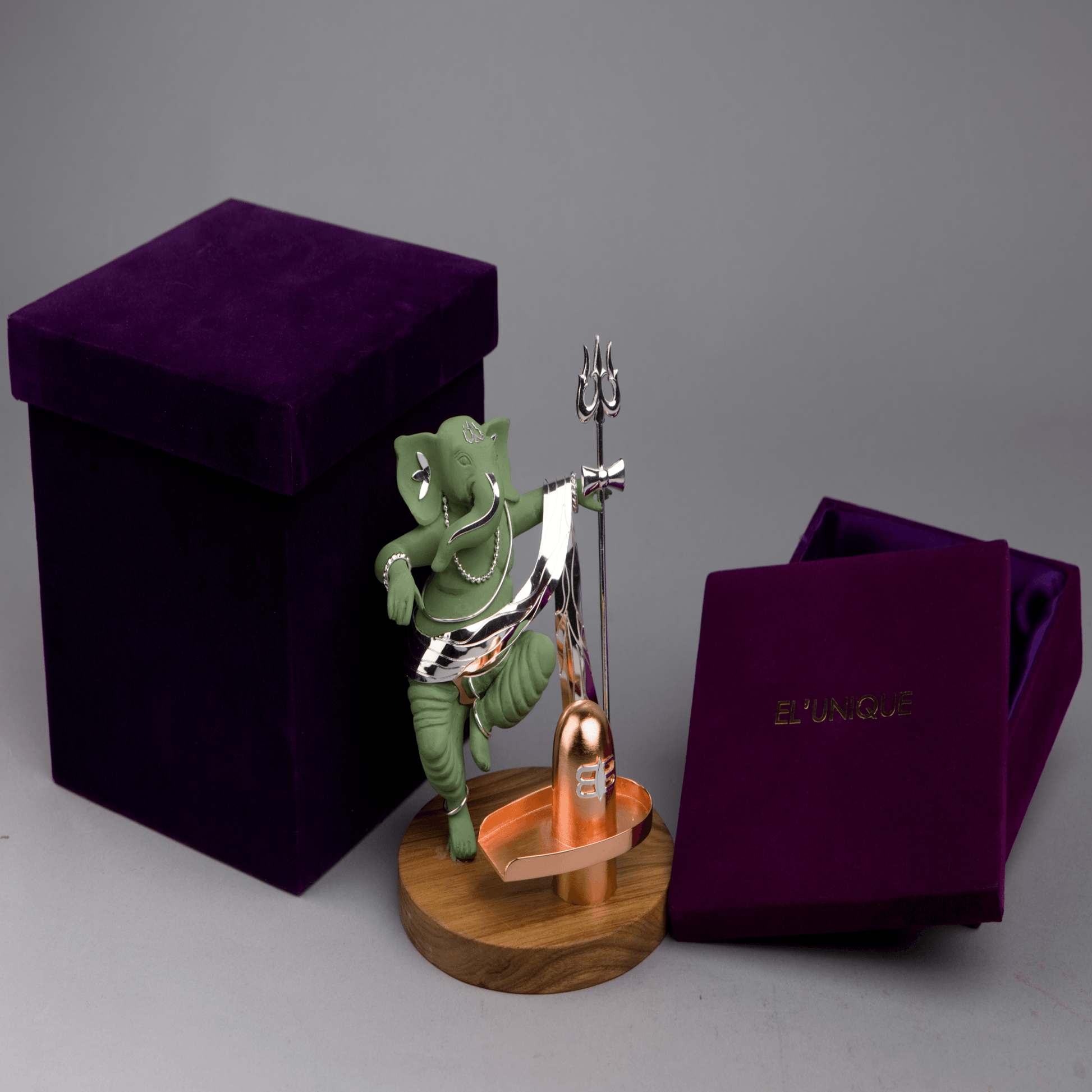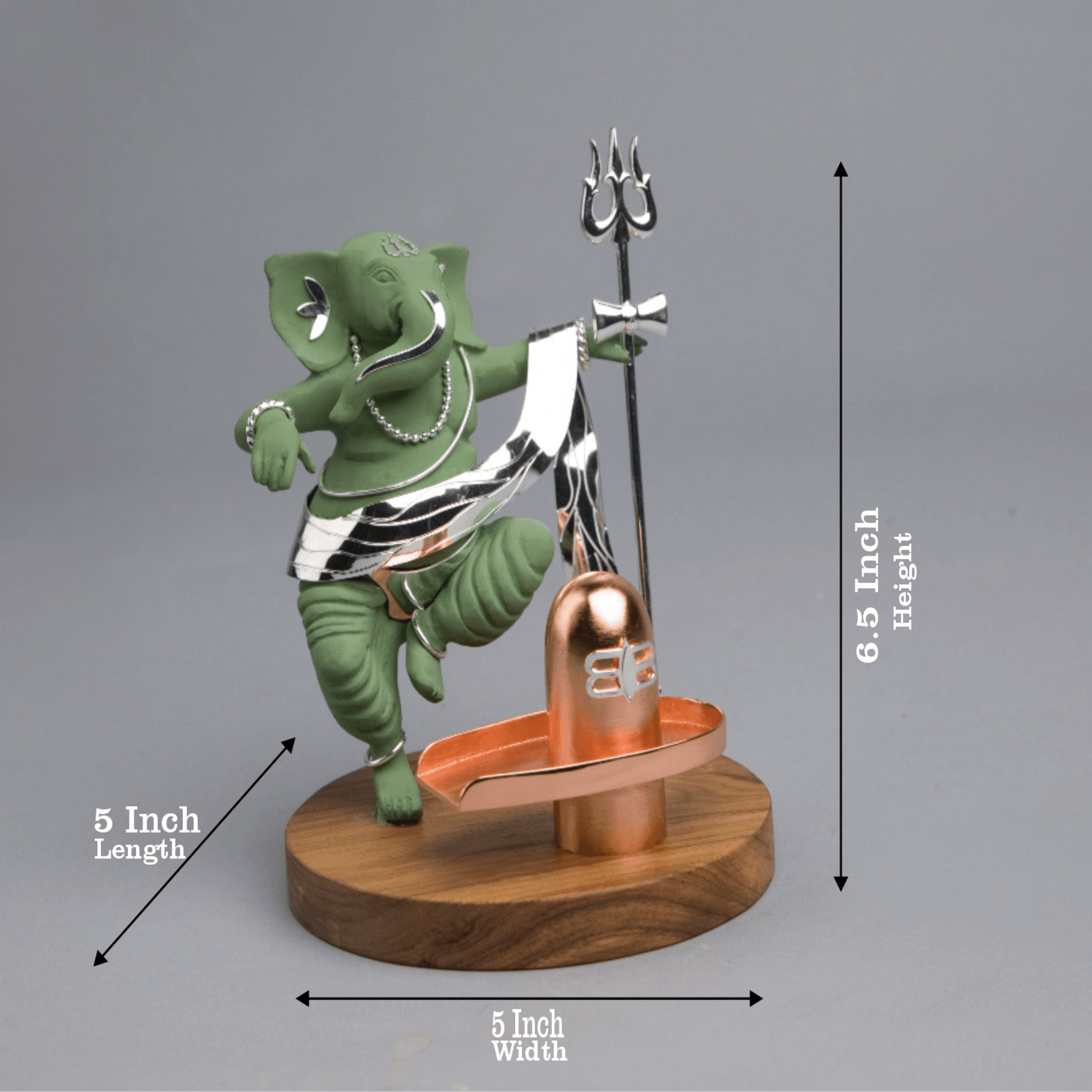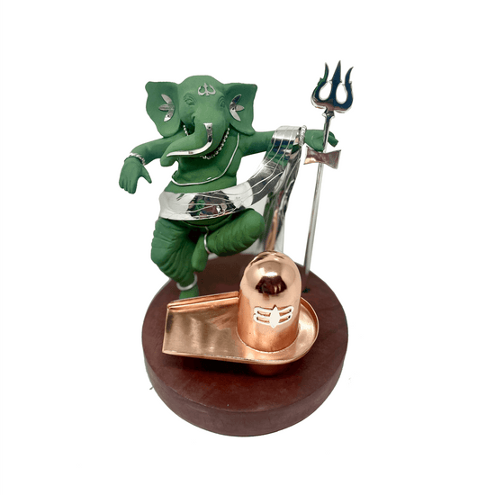 This elegant decorative silver Shiv Ganesh with a Shivling features a poly resin green Ganesh adorned with silver plated artistic highlights in an anti-tarnish finish. The set is placed on a wooden base, making it a unique artifact that promises a lifetime of viewing pleasure. Additionally, the set includes a silver Ganesh on a Mouse, heavily plated with silver and lacquered for a lasting finish. This piece is an ideal gift for corporate events, weddings, anniversaries, housewarmings, opening ceremonies, and all other special occasions