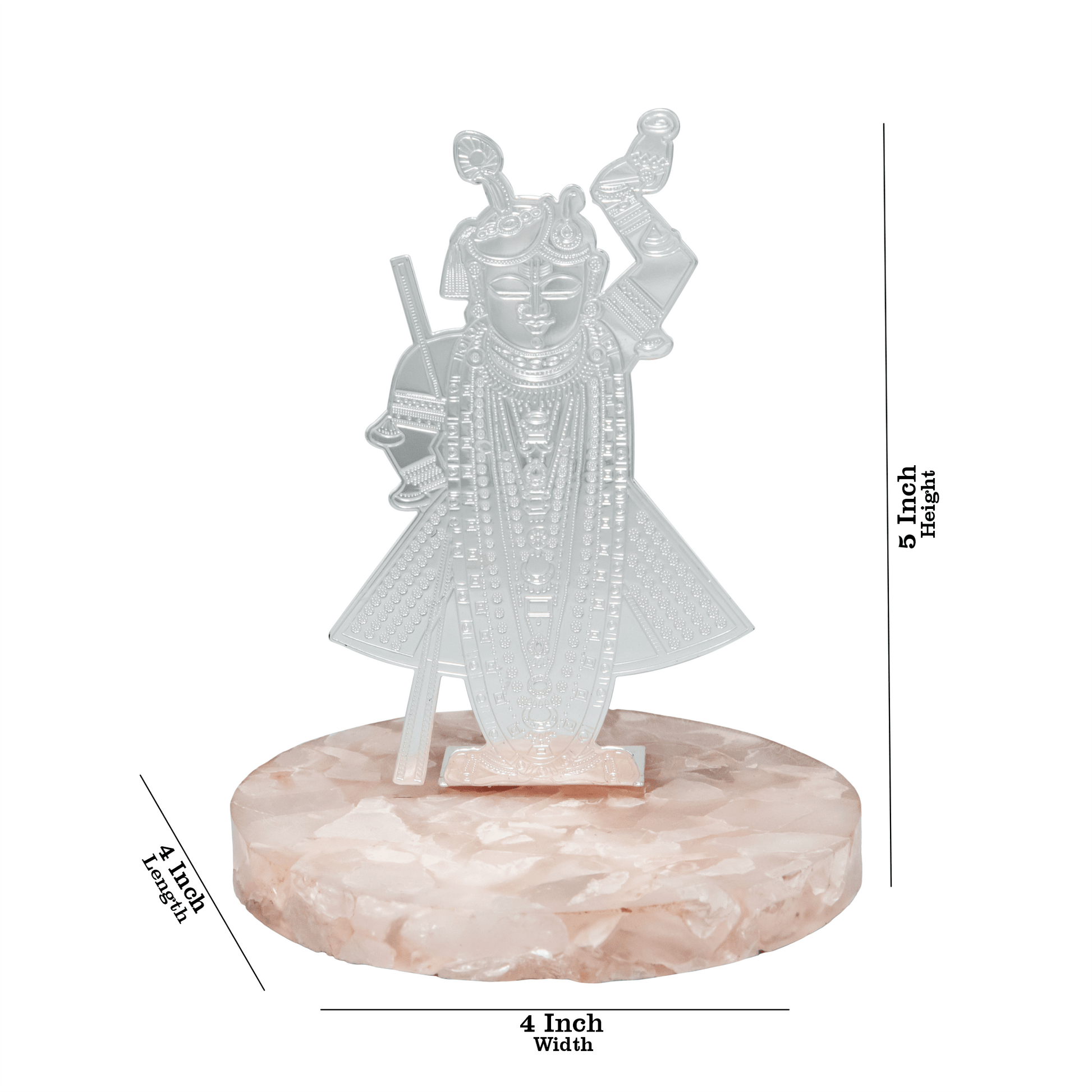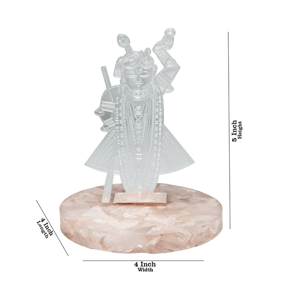 Crafted from high-quality brass with a gleaming silver plating, the Shri Nath Ji Showpiece is a stunning figure elegantly mounted on a base of rose quartz, exuding serene beauty. Ideal for placement in your car or on a table, it serves as both a spiritual symbol and an attractive decorative accent, enhancing your space with its exquisite presence.