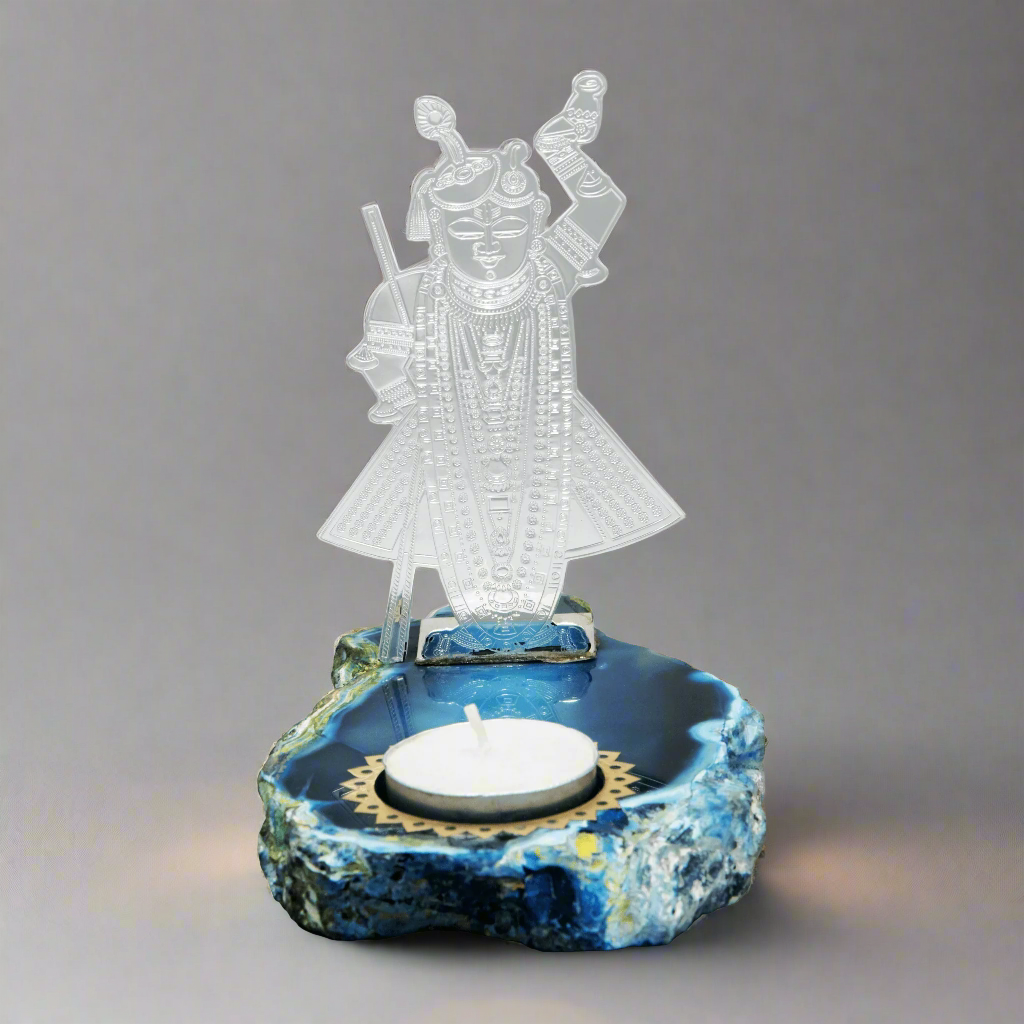 Enhance your space with the Shri Nath Ji Tea Light on Agate Base. This exquisite piece features a high-quality brass figure with elegant plating, securely attached to a stunning agate stone. Perfect for creating a serene and stylish ambiance in any room.
