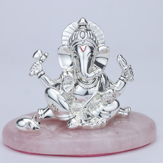 This Silver Ganesha Namah on Rose Quartz Stone Base is expertly crafted with pure 999 silver, providing an elegant and meaningful addition to any space. The intricate design showcases the divine nature of Lord Ganesha and is securely placed on a beautiful rose quartz stone base, making it a perfect gift for any devotee or spiritual seeker.