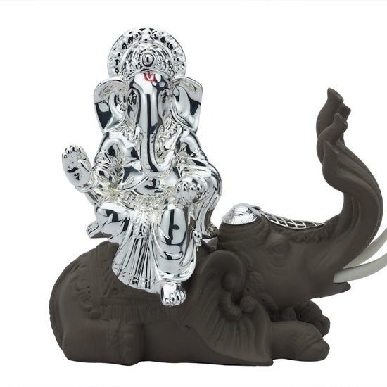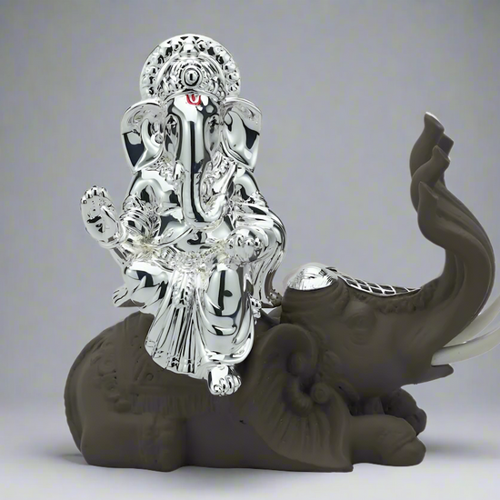 This Silver Ganesha On Elephant figurine features a pure 999 silver Ganesha and a resin elephant. With its exquisite craftsmanship and intricate details, this figurine makes a beautiful addition to any home decor. The charm and elegance of silver, combined with the strength and stability of an elephant, symbolize the prosperity and good fortune that Ganesha brings.