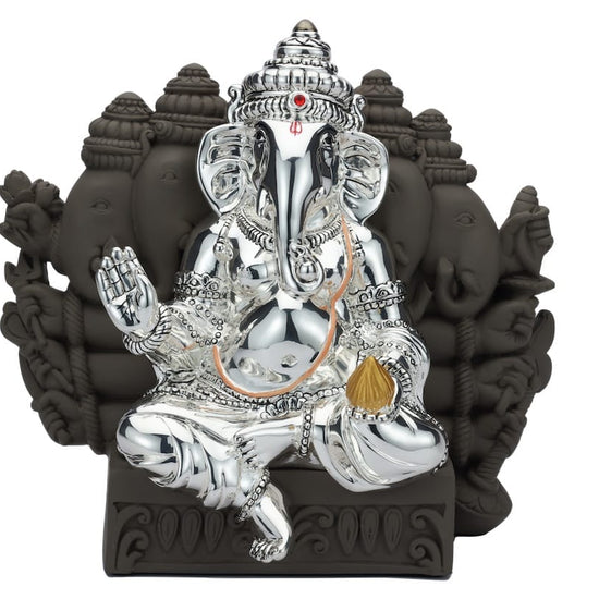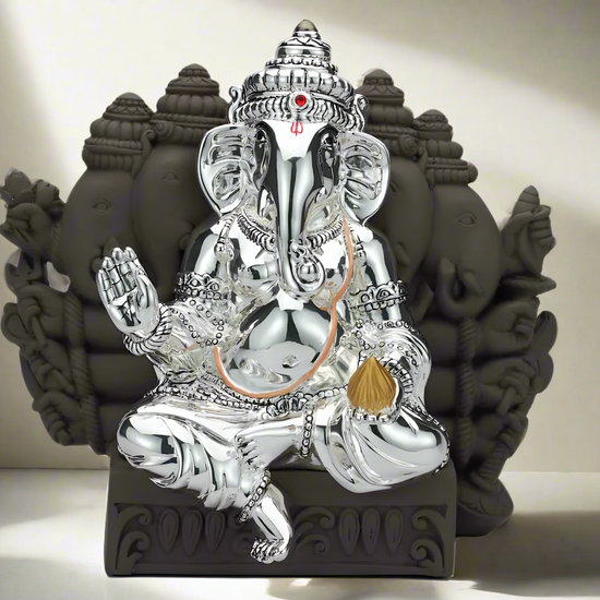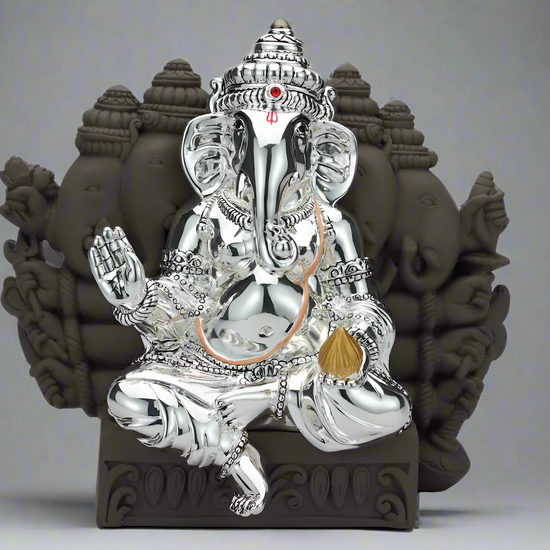 Experience the divine energy with the Silver Panchmukhi Ganesha statue. Expertly crafted with pure 999 silver, it features the iconic Panchmukhi form of Ganesha with four arms, holding his broken tusk and a delicacy. This depiction symbolizes wisdom and prosperity. Perfect for home decor and spiritual practices.