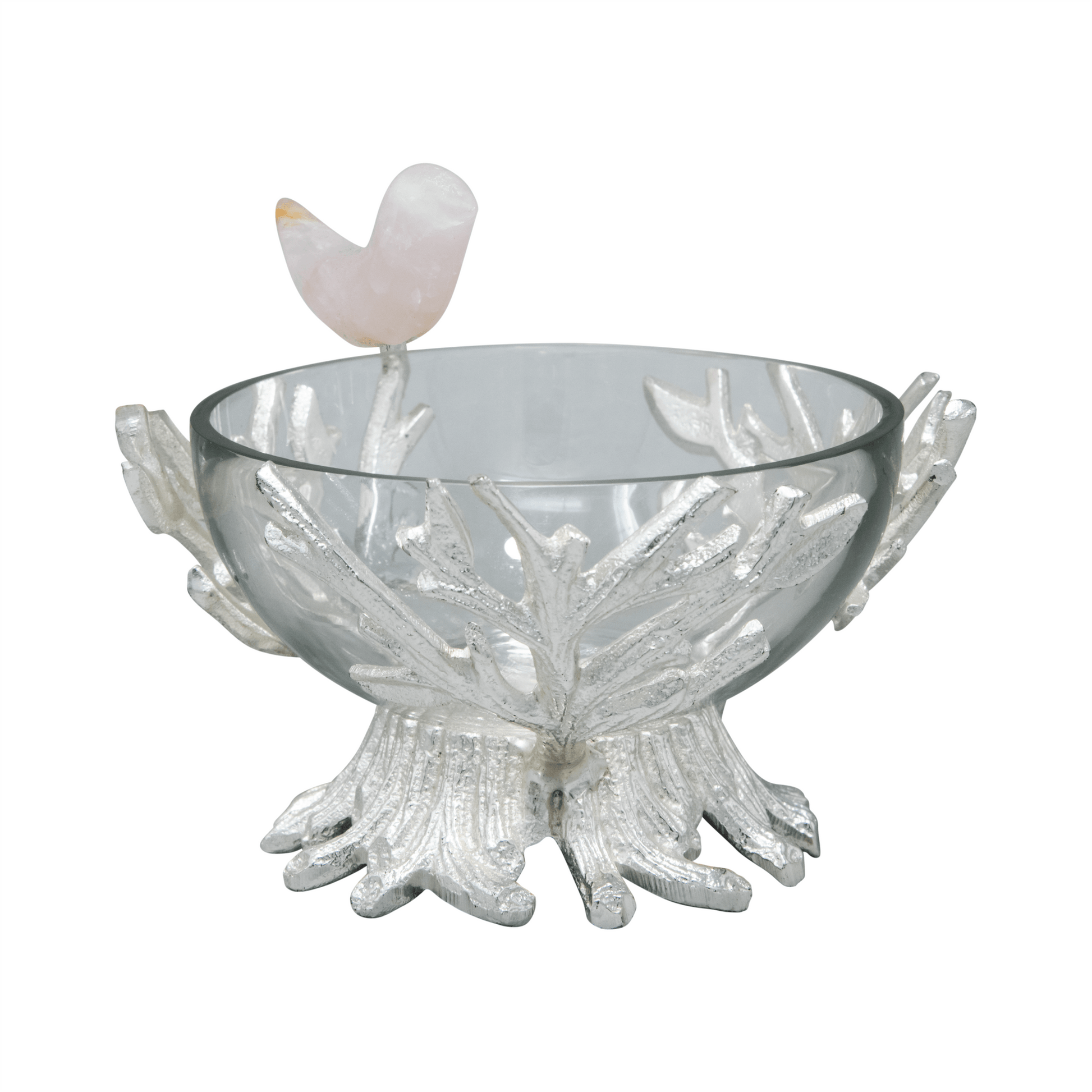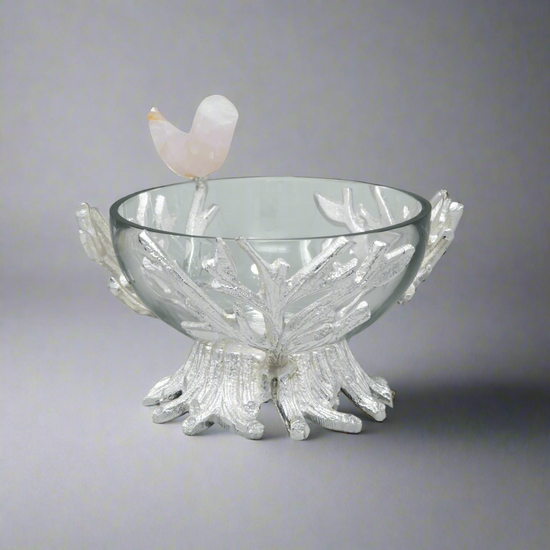 The Birds Glass Bowl with Leaf Stand features a delicate glass bowl adorned with rose quartz bird perched gracefully atop it. The elegant leaf stand is meticulously crafted from brass with silver plating, making it a stunning and unique piece for any home decor.