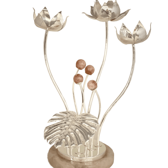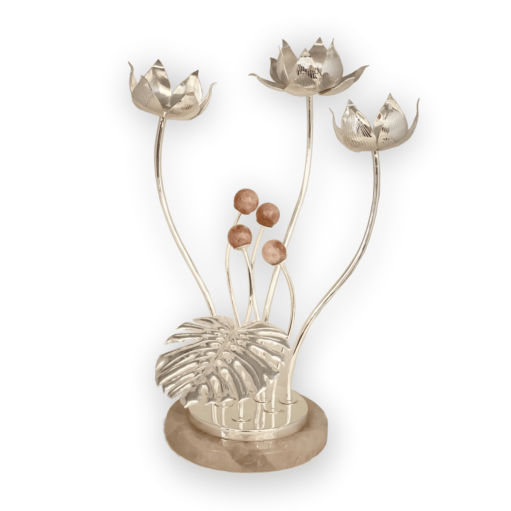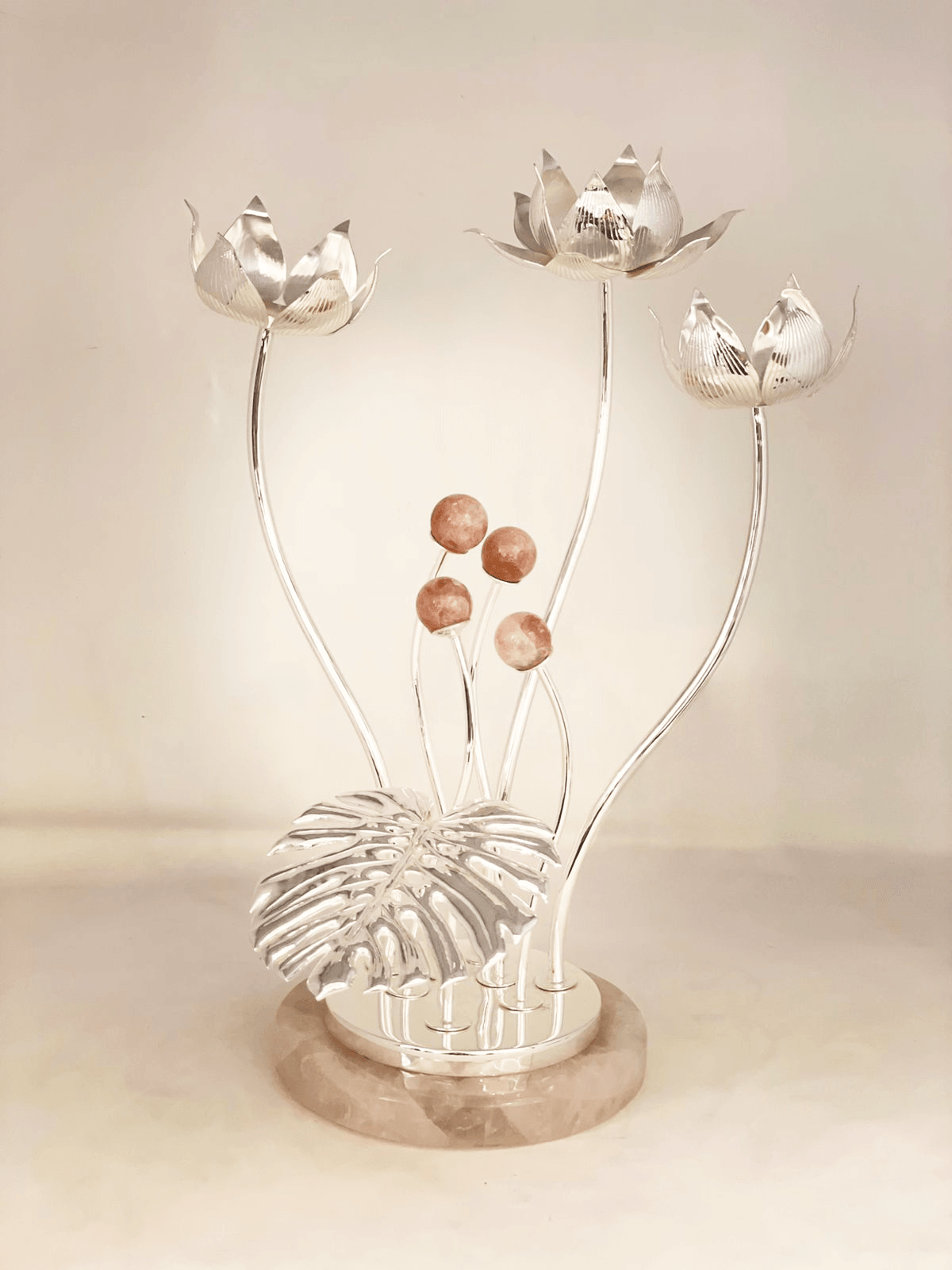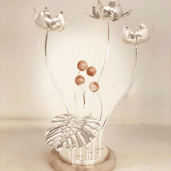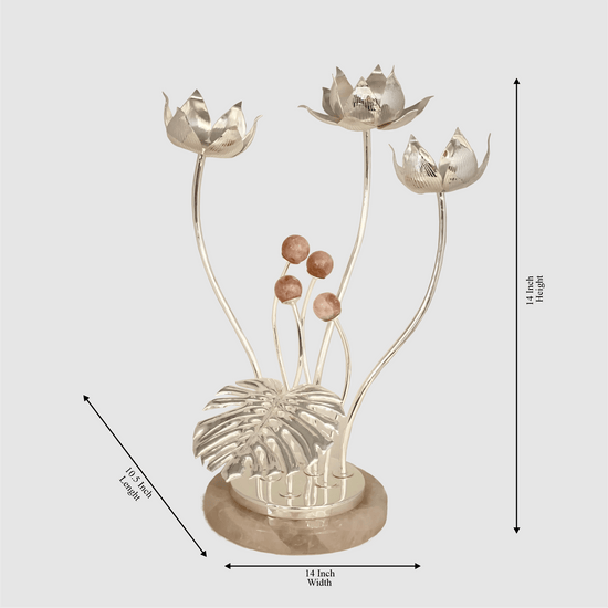 Add a touch of elegance and serenity to your home with this unique centerpiece. Featuring stylized lotus that double as tea light holders, this brass piece with silver plating is both durable and easy to maintain. Perfect for gifting on birthdays, anniversaries, or weddings.