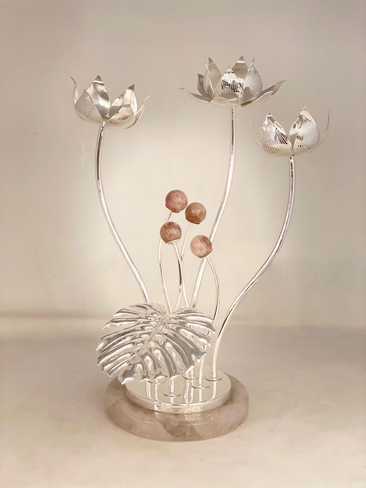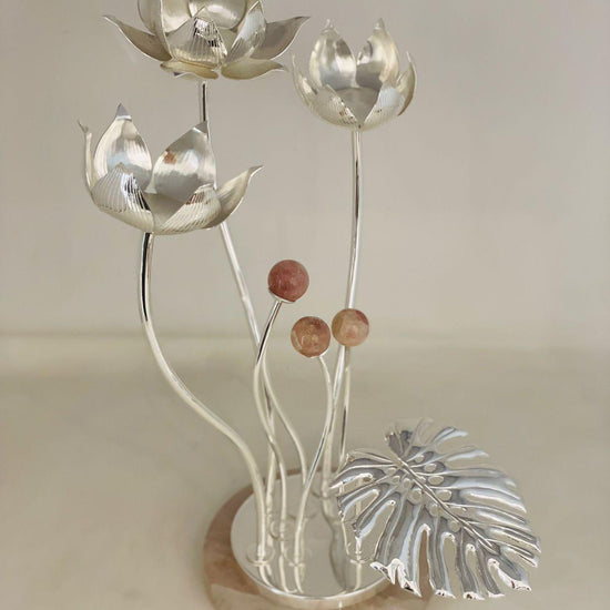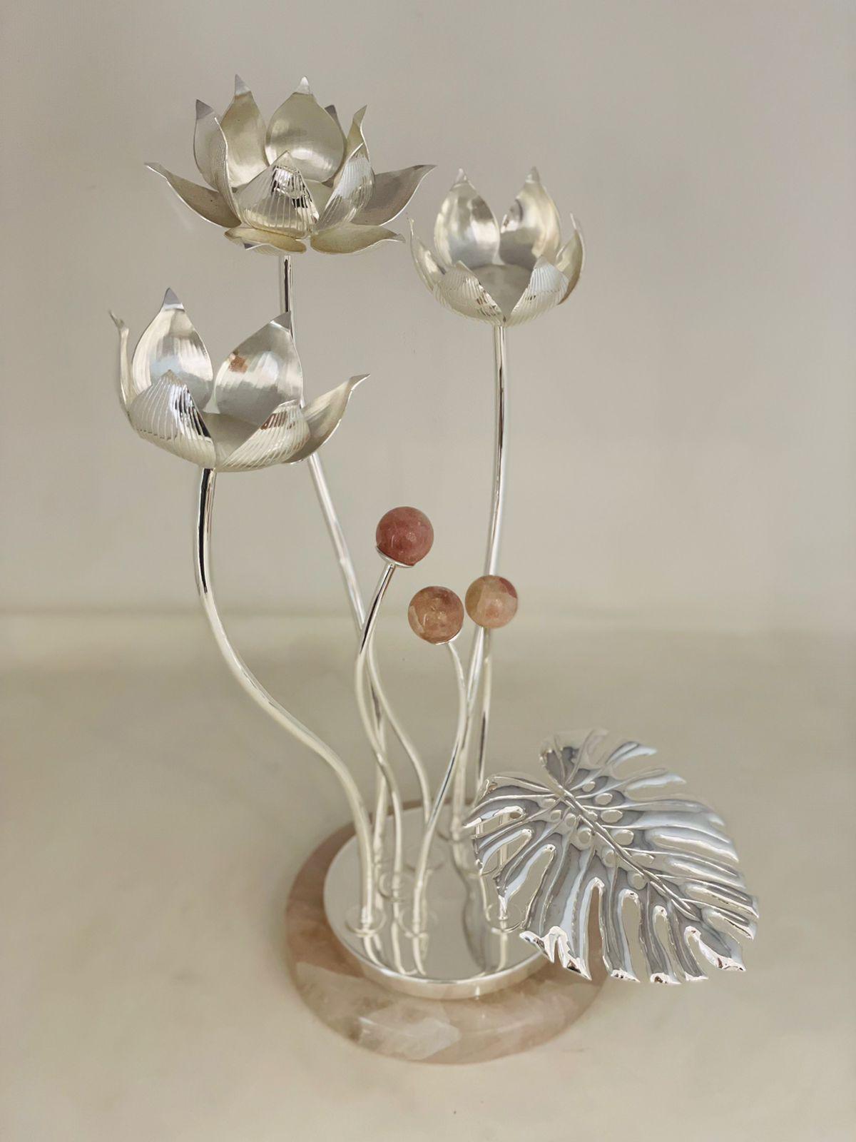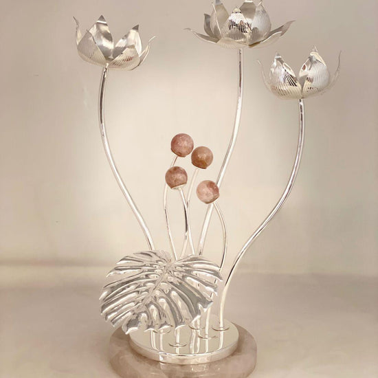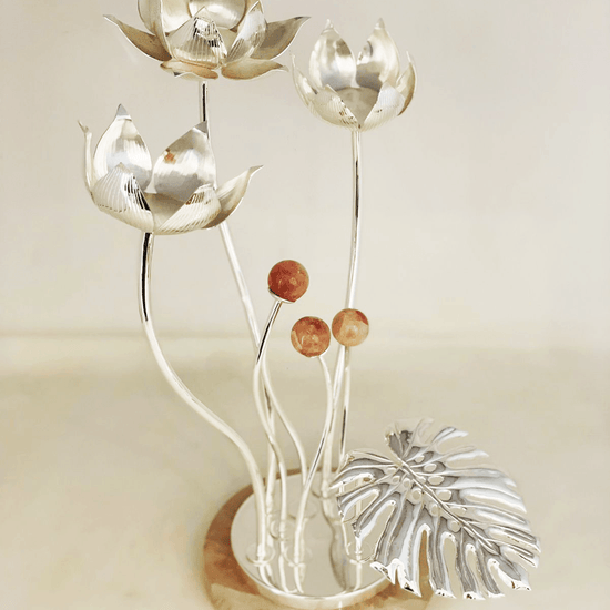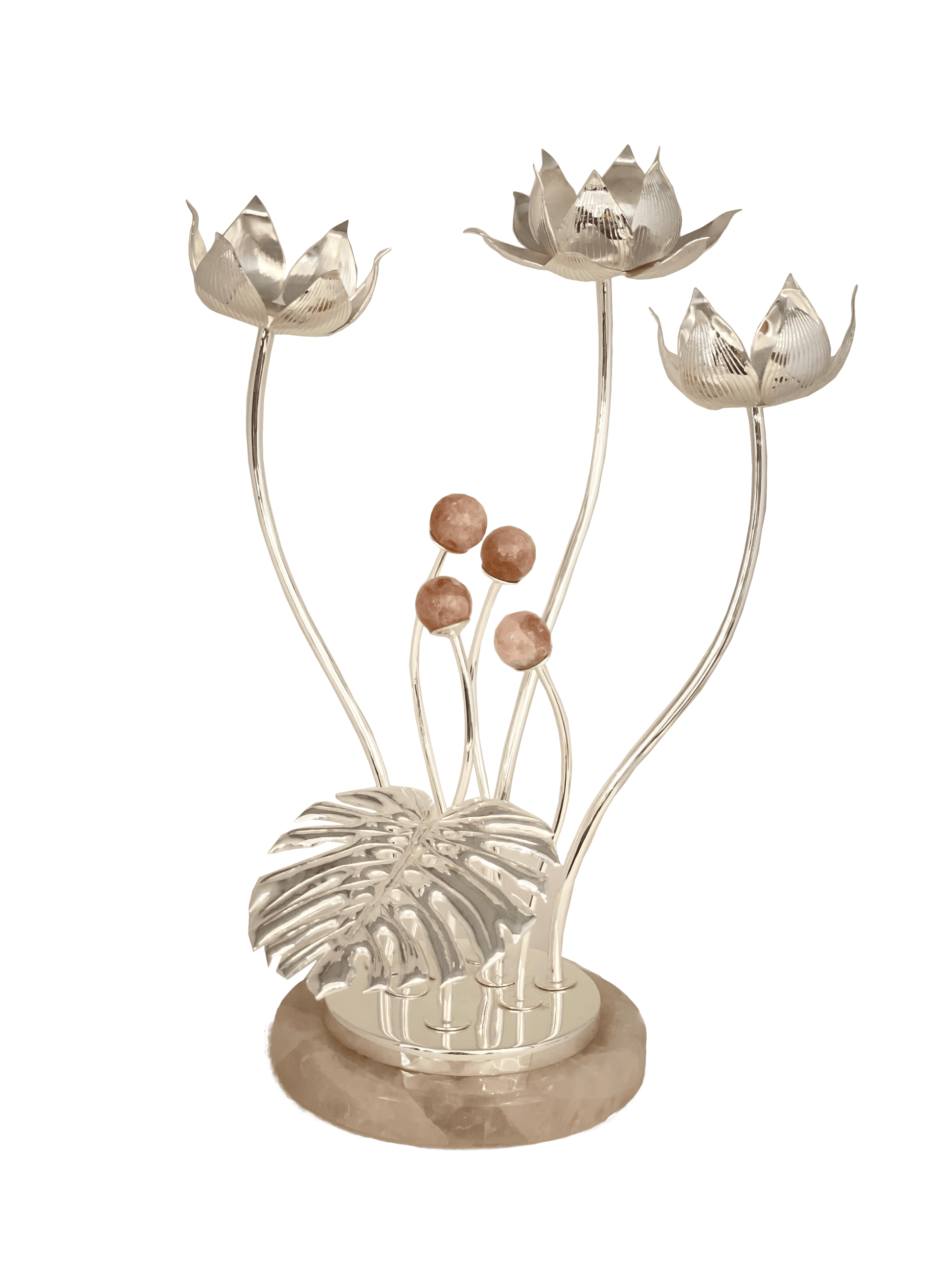 Add a touch of elegance and serenity to your home with this unique centerpiece. Featuring stylized lotus that double as tea light holders, this brass piece with silver plating is both durable and easy to maintain. Perfect for gifting on birthdays, anniversaries, or weddings.
