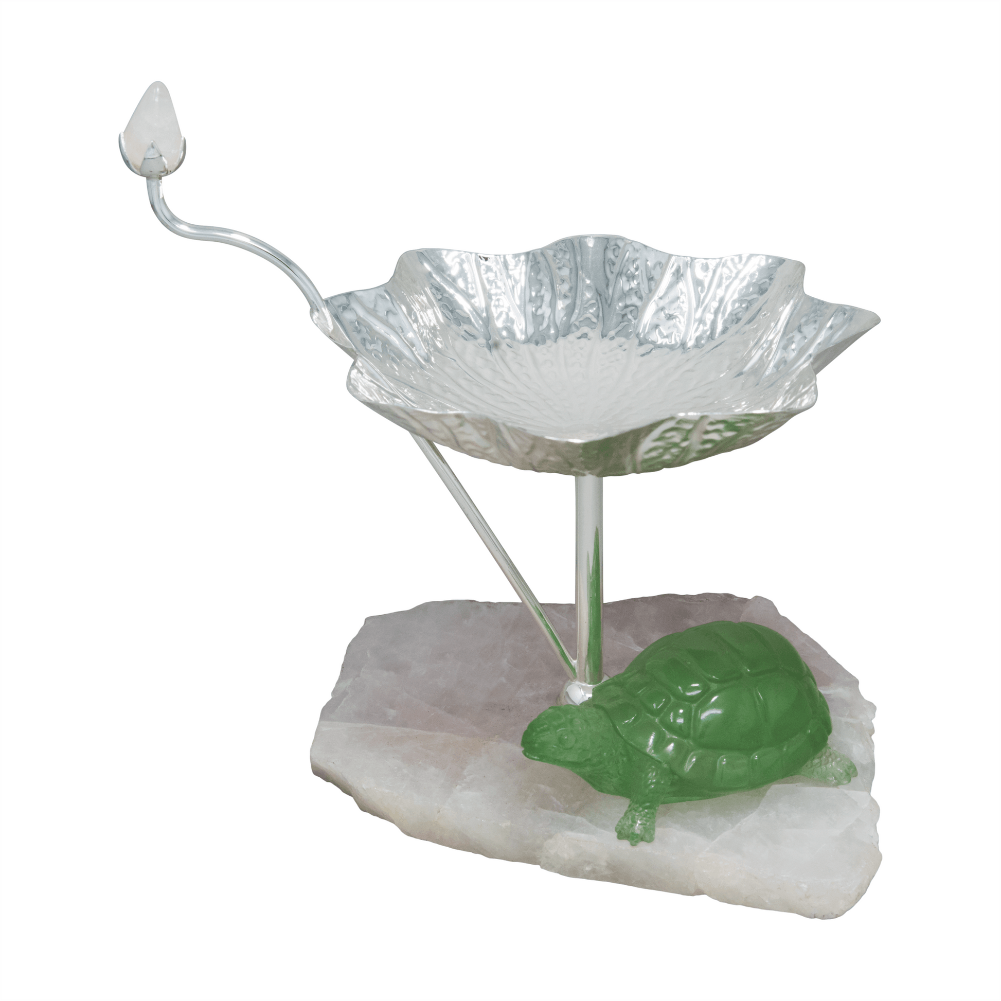 Add a touch of natural beauty to your decor with Tortoise Platter on Rose Quartz Base. Crafted from brass with silver plating, these elegant pieces showcase intricate green resin tortoises, creating a stunning focal point for any space